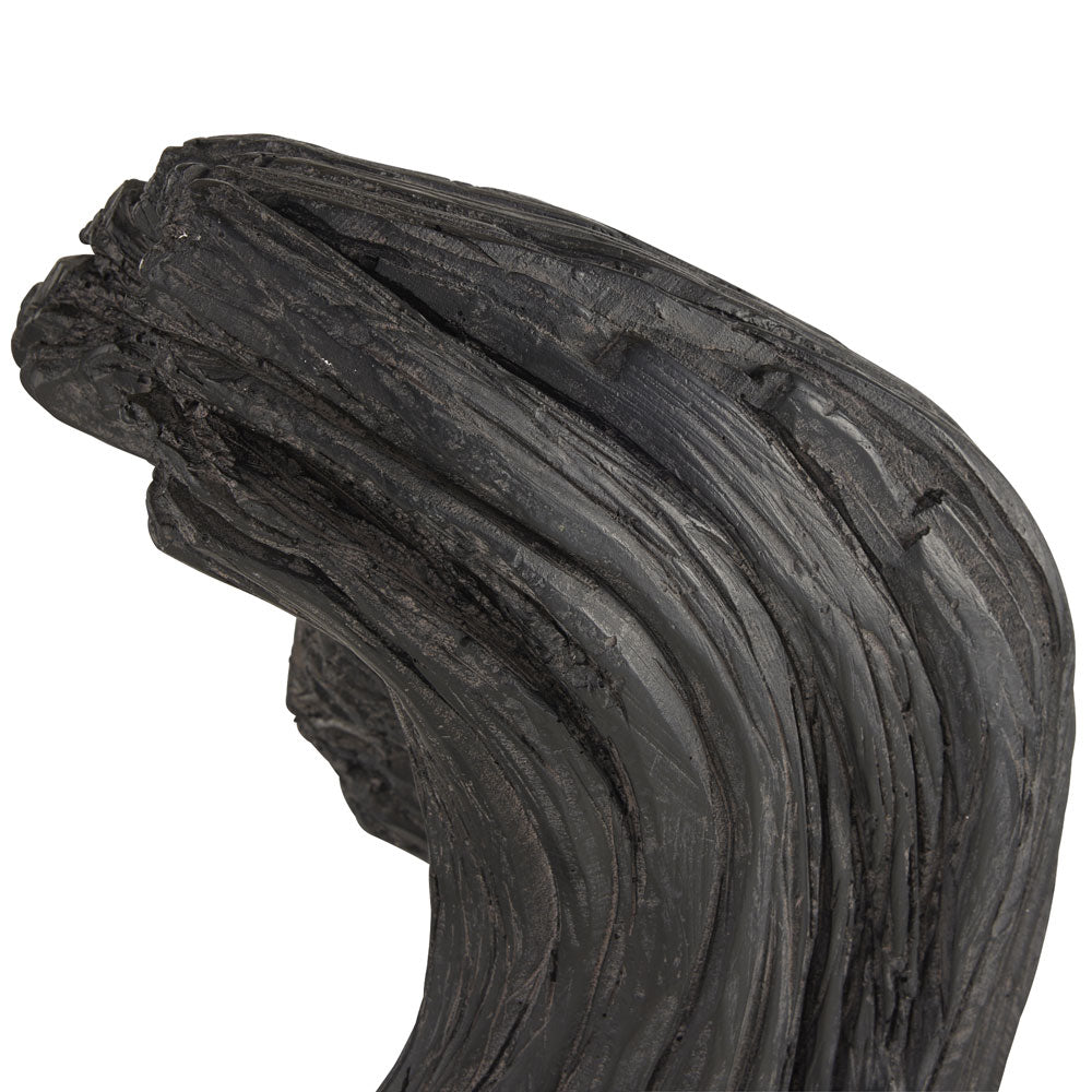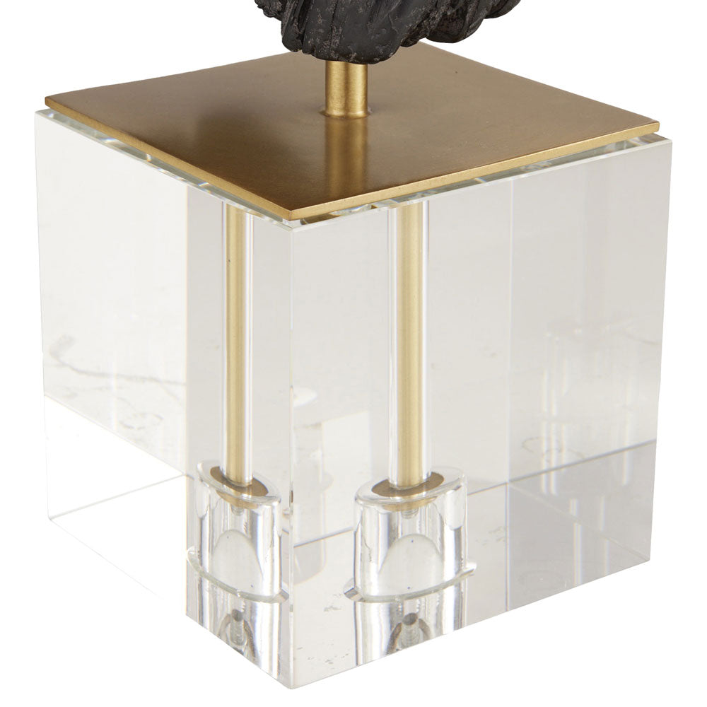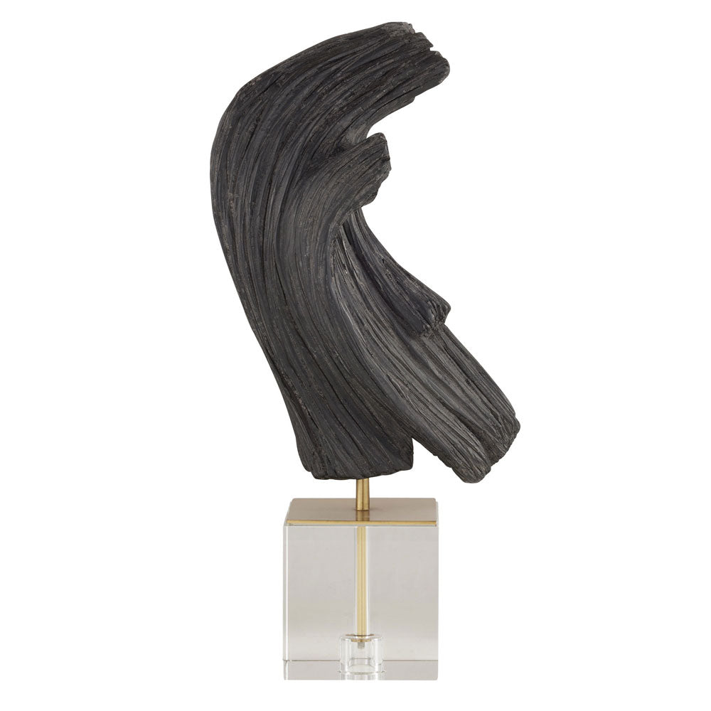 Add architectural flair to your coffee table or desk with this elegant and artful Arteriors Edris Sculpture. A sinuous resin form of ebony faux wood is cast to resemble natural driftwood. Designed with a swooping form that reflects movement, this eye-catching accent for the table is mounted on an antique brass steel plate resting upon a crystal-clear base. Give your bookshelf, office, night table or coffee table a little stylish touch with this eye catching Arteriors Edris Sculpture. Great for adding texture to any space, this Arteriors Edris Sculpture also makes a thoughtful housewarming gift for the friend or family member that's always looking for the most unique pieces. This art piece is a great conversation starter and effortlessly elevates your home's aesthetic.