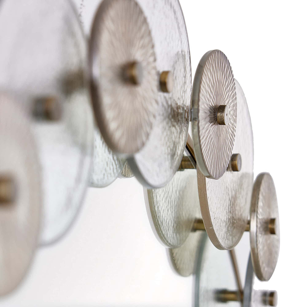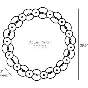 The Arteriors Trixie Mirror stands out from the crowd with its artisan craftsmanship and unique design. The handcrafted glass discs on a circular antique brass iron frame give it a contemporary look and create a sense of movement and fluidity in any room. Equally stylish and sophisticated, the Arteriors Trixie Mirror is the perfect addition to any luxury home. Bringing a touch of class and modern elegance, this mirror is sure to be a conversation starter. With its distinctive design, the Arteriors Trixie Mirror provides a unique styling option for any space.
