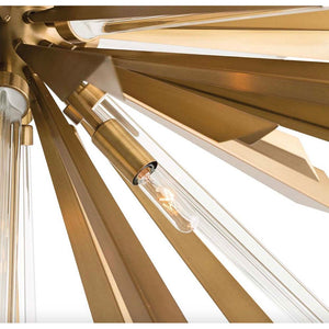 Depth and scale are transformative features in this eight-light chandelier. Angular steel shards in varying sizes extend from the center, creating a vibrant form finished in antique brass. Clear glass rods are interspersed throughout, adding a nicecontrast from the metal. Available in a larger size or vintage silver finish. Additional pipe available (PIPE-101). Approved for use in covered outdoor areas.
