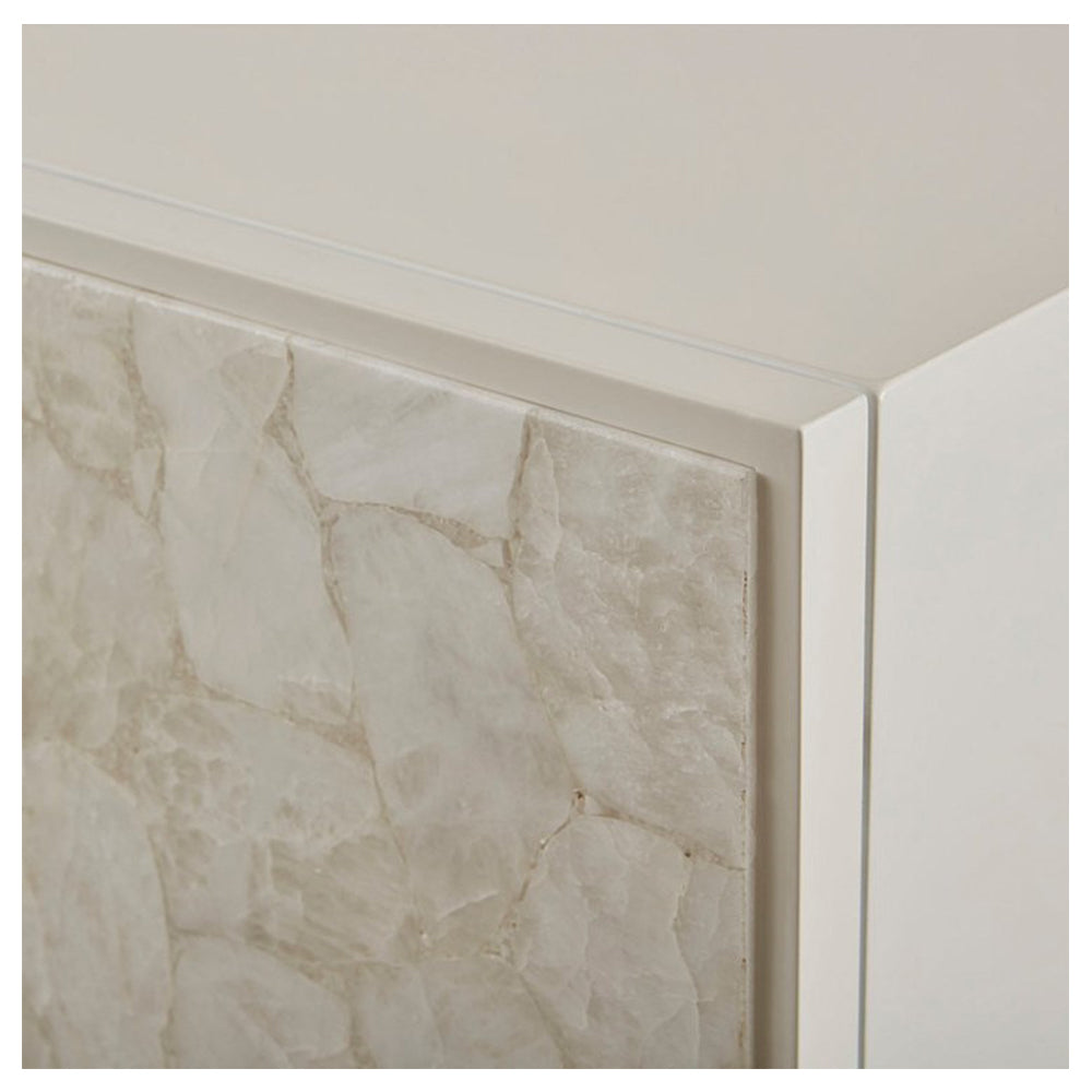 Blending the retro style of mid century designs with a pop of glam, this Baker Luxe Kira Credenza is the perfect place to tuck away your belongings. Add some function and style to your living room with the sensational Baker Luxe Kira Credenza. A beautiful plain white lacquer shines against white quartz detailing to each door.It’s perfect for storing your everyday essentials without compromising on modern style. The Baker Luxe Kira Credenza is emblematic of the Baker Luxe Collection, mixing modern design with metals and semi-precious materials. Its floating, white quartz doors are perched on corrugated brass.Thanks to its retro appeal, it will look right at home in any setting. Push-to-open doors add that little touch of convenience while keeping the cabinet doors looking clean and unfussy. Elevated on corrugated brass, this Baker Luxe Kira Credenza looks ethereal and welcoming straight away.