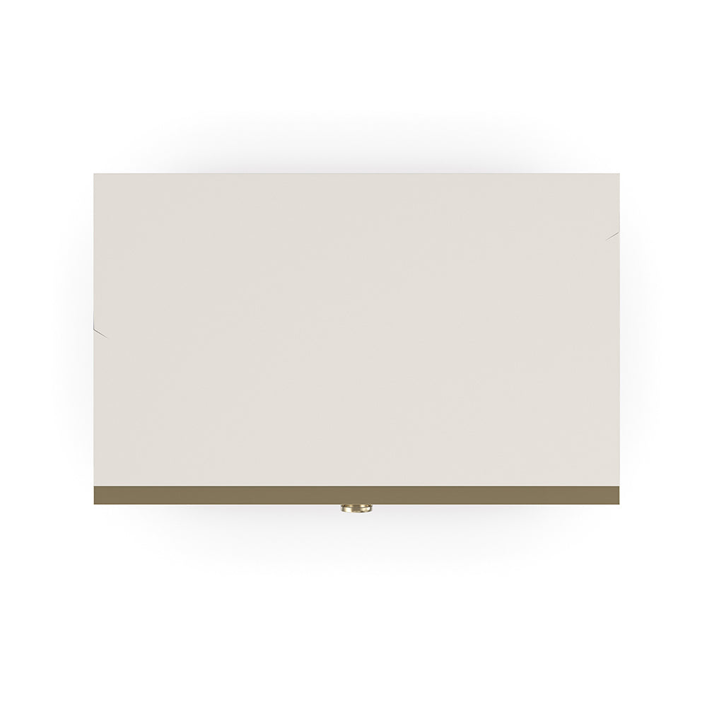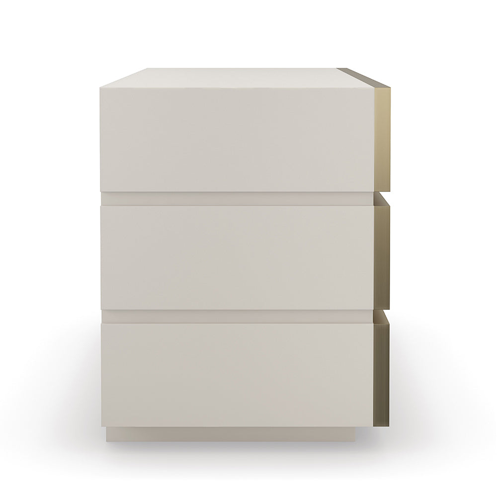 This Caracole Bedrock Nightstand is an exquisite addition to any interior space. Rendered in luxe almond milk and accented by gray sandstone drawers and a decadent champagne gold trim, this piece is sure to inspire a sense of grandeur in any bedroom. It's also designed with a plinth base in almond milk and under-mount drawer guides for an extra touch of luxury.