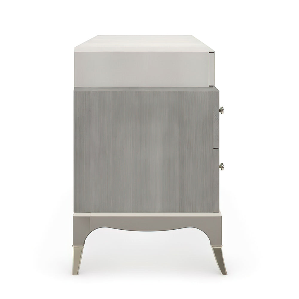 The Caracole Vibrato Nightstand provides ample space for all your bedside essentials and keeps the area around your bed organized. With a top box wrapped in Alabaster-painted faux shagreen, the Caracole Vibrato Nightstand celebrates the art of adornment in contemporary form. A creamy Cappuccino finish highlights the linear grains of Coffee Platano veneers, accentuated by decorative backplates in a Whisper of Gold and custom hardware with a ceramic inset. Features two spacious drawers beneath the top box, elevated on outward curving legs capped in metal ferrules. This 2-drawer Caracole Vibrato Nightstand features clean lines and extra storage space for bedside essentials, giving it a modern and functional design in your bedroom or guest room. This Caracole Vibrato Nightstand will excellent addition to any room. A design that brings an air of sophistication to any room it would be found. Our nightstand allows you to upgrade your bedroom or living room as a side table.