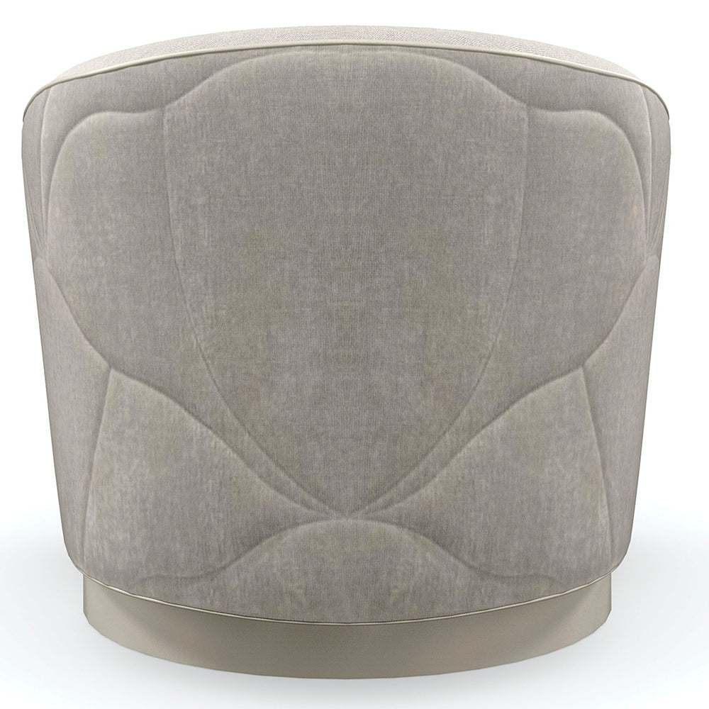 An all-around standout, this softly curved swivel chair introduces a free-flowing, organic style to seating areas. A quilted ginkgo leaf pattern fanning out along the back creates repetition and subtle movement, accented by a cream-colored contrast welt and plinth base wrapped in pearl vinyl. Expertly tailored in tonal gray performance fabrics, inside and out, for a look of luxury that's also livable. Makes a statement on its own, even more, dramatic in pairs.