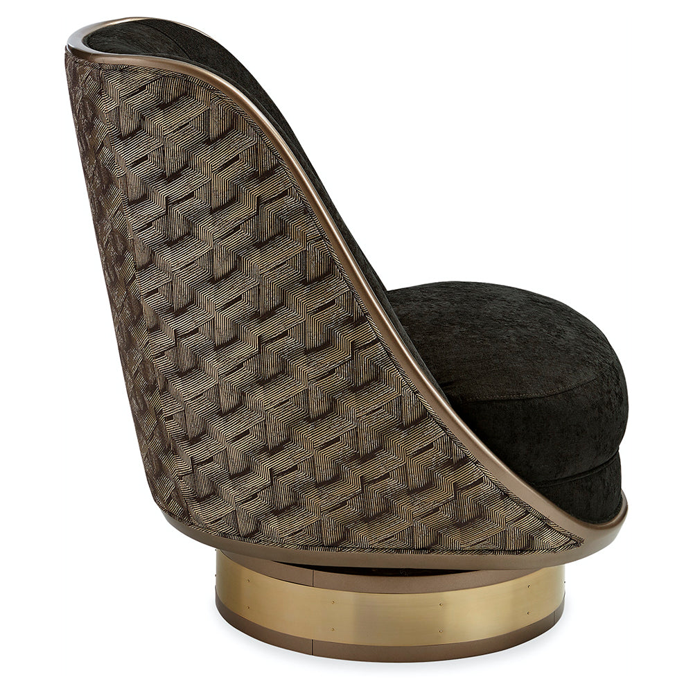 Expressing your unique perspective is easy with this sublime swivel chair. Bold in its every detail, it features a barrel base finished in Harvest Bronze with a Champagne Gold metal wrap. Two luxe fabrics are combined to masterful effect while a painted wood trim creates a pencil rail outlining its shapely silhouette. Its interior is upholstered in a plush espresso chenille while its exterior is impeccably tailored in a textural geometric pattern highlighted with gold metallic yarns. Perfect on its own or paired together for visual impact, this chair represents the essence of Art Deco modernized for today's lifestyles.