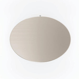 Oval-shaped nightstand adds soft curves and subtle shimmer to bedroom interiors. Finished in an alluring Soft Silver Paint, it adds a note of glamour, accented by metal ferrules in Polished Stainless Steel. Features three soft-close drawers to neatly keep bedside essentials, books, and magazines. Elongated drawer pulls, inspired by an Art Deco jewelry pendant with a faux stone center, draw the eye with their graceful, flowing form.