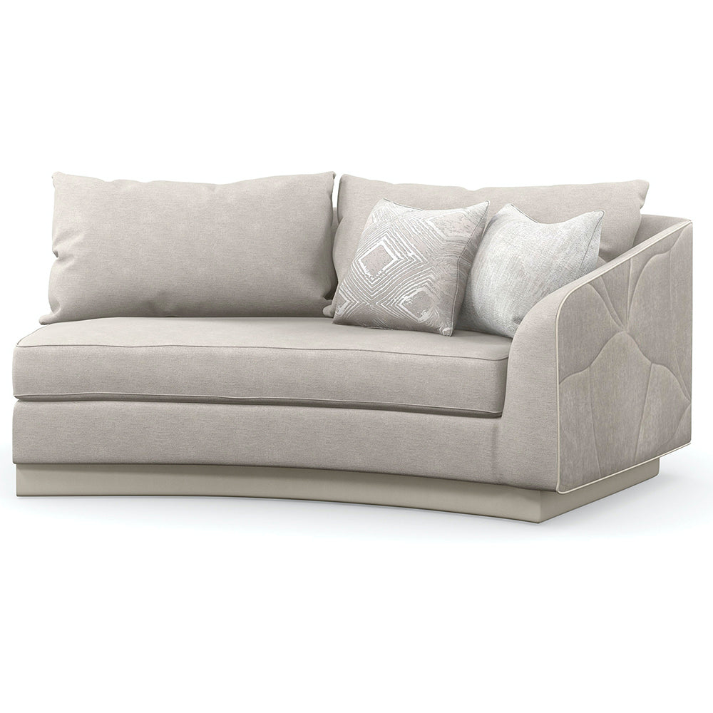 Free-flowing and organic, Fanciful's soft curves are artfully accented by a quilted ginkgo leaf pattern, fanning out along the back and sides. Its nature-inspired design adds graphic interest and dimension, complemented by a curved plinth base wrapped in pearl vinyl. Expertly tailored in tonal gray performance fabrics, inside and out, and trimmed in contrast welt. For a finishing touch, we've added accent pillows in soothing neutral hues and a subtle pattern. Pair with the matching Fanciful swivel chair.
