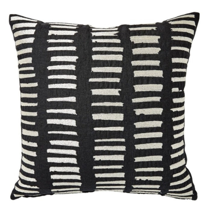 Elevate any space with our Global Views I See You Hear Pillow. Inspired by African mud cloth and expertly embroidered on luxurious linen, this pillow adds a touch of intricate art to your decor. Plush down insert included. Available in classic black and cream.