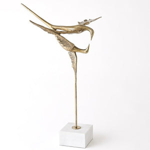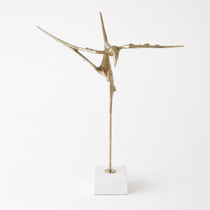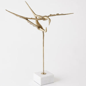 Experience the beauty and elegance of flight with our Reflection Sculpture. Inspired by the graceful reflection of a bird soaring over a tranquil lake, this handcrafted piece is made from cast iron with a stunning faux brass finish. Displayed on a white marble base, it adds a touch of sophistication to any space.