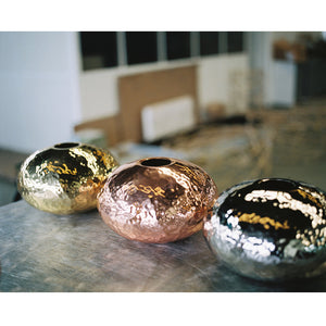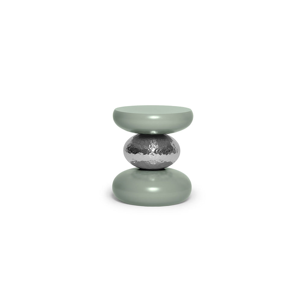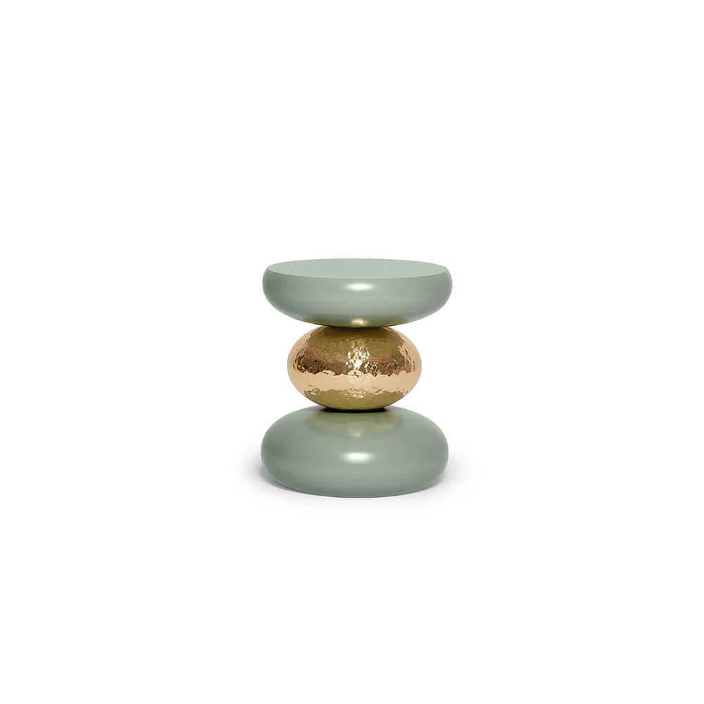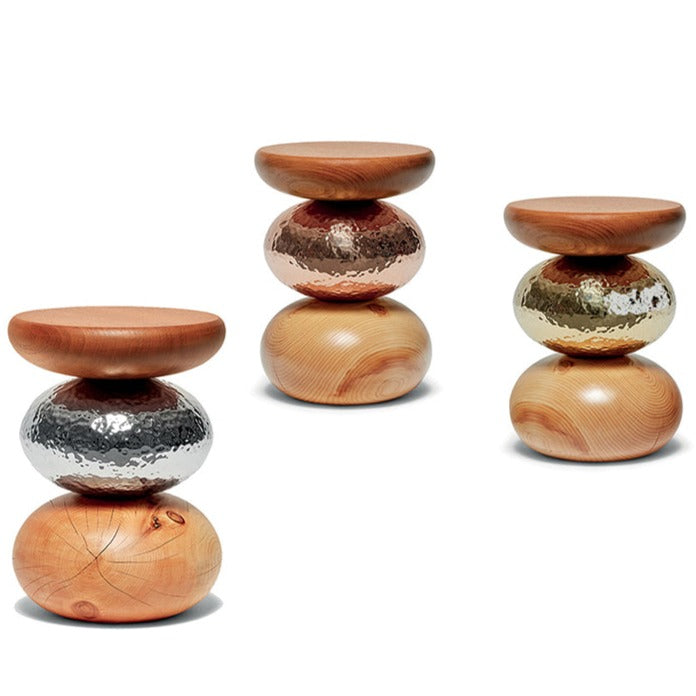 Resembling the stacking pebbles found in a lake or a pond, the Pebble provides a feel of harmony. The blend of natural exotic wood with hammered metal emanates a sense of balance, suited for any living space.