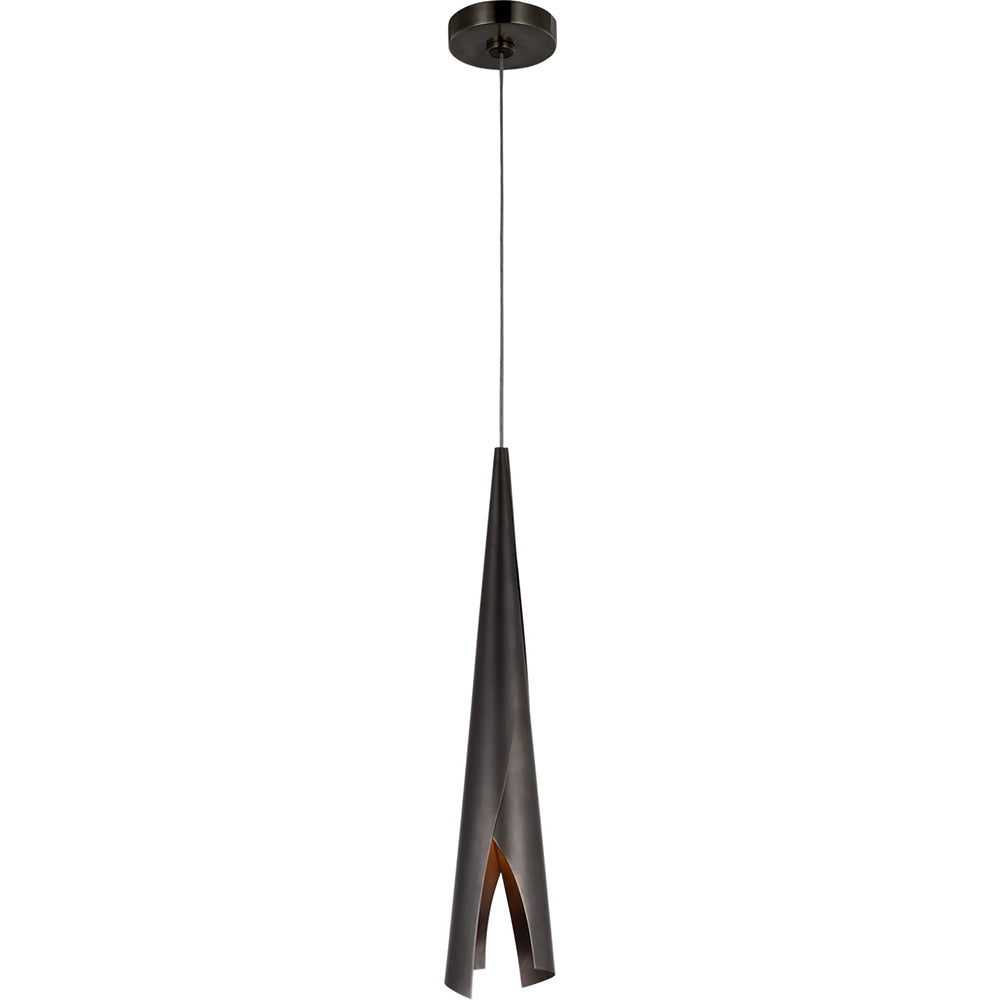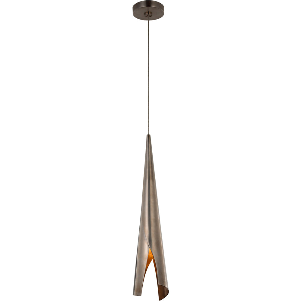 Harnessing the pliability of delicate metal sheeting, the Piel Small Wrapped Pendant’s sculptural folds cradle its ambient light like diaphanously folded cocoons. Twin elements of dramatically curved sheets of Burnished Brass, Bronze or Pewter conceal the integrated warm L.E.D. light source. These free-hanging pendants are available in three sizes.