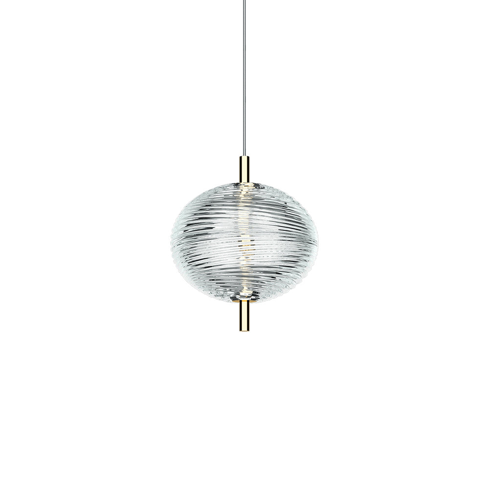The Jefferson suspension lamp designed by Luca Nichetto is reminiscent of music and iconic images in psychedelic works of art from the 1960s. The vortex motif decorating the diffuser is embellished by the timeless classicism of Bohemian crystal, which diffuses evocative atmospheres of light. Dynamic in its many sizes and multiple compositions, Jefferson’s elegance keeps up with the excellent performance of LED interior lighting. Designed by Luca Nichetto, Jefferson is a suspension lamp in precious Bohemian crystal inspired by the psychedelic visual arts of the Sixties. The vortex pattern that characterises the surface of the diffuser recalls the artistic movement of the counterculture of the late 1960s and its kaleidoscopic and whirling chromatic patterns, which Jefferson elegantly celebrates in a subtle play of luminous suggestions. Jefferson reinterprets the geometric pattern on Bohemian crystal through a special pressing technique that imprints meticulous details on the transparent surface. Jefferson’s Mini version consists of two elliptical crystal diffusers joined together on a black chrome or golden frame that seems to make the crystal rotate like a spinning top. The addition of cylindrical modules extends the size of the lamp in Small and Medium variants thanks to a simple interplay of joints. Suspended from a thin yet highly resistant cable thanks to the built-in Kevlar reinforcement, Jefferson diffuses a warm and elegant light. It features a 3 W LED module with a Colour Rendering Index (CRI) equal to 90, meaning true colour reproduction. The light developed by the LED source is enhanced by the interplay of reflections between the surface motifs of the crystal and the frame. The different dimensions of Jefferson and the possibility of cluster compositions multiply the dynamics of light and infuse a personal touch to different environments. An evocative combination of form and sign, classicism and innovation, Jefferso represents a refined solution to transform any space into a warm living environment.