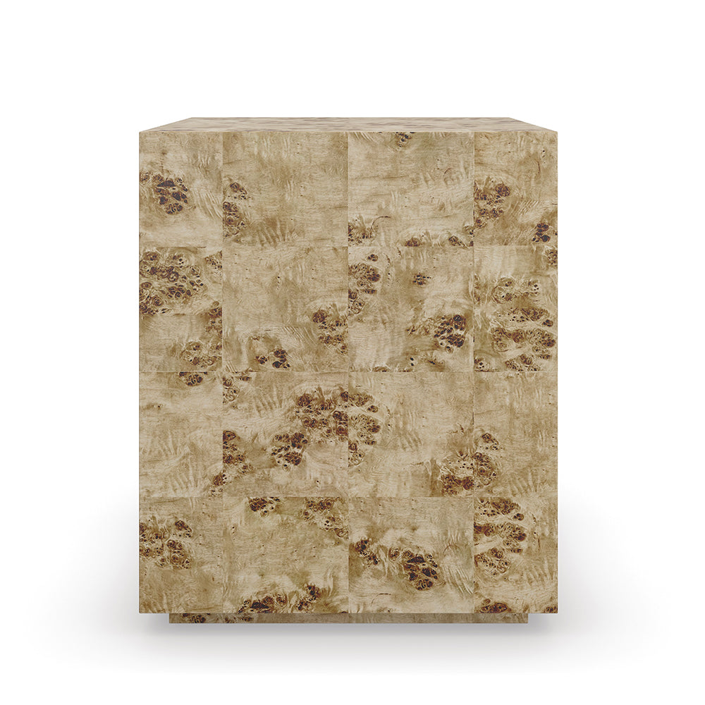 Unveil the opulence of Caracole's Burlesque End Table: featuring a case finished in Mappa Burl and an open storage area cloaked in Brazen Bronze Leaf, befitting of royalty. Adorned with one drawer equipped with soft close side guides and a stunningly vibrant UV Chocolate interior, this exquisite piece invites a regal touch to any space.