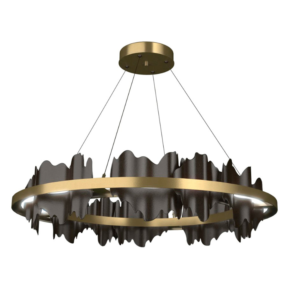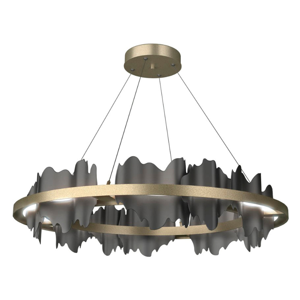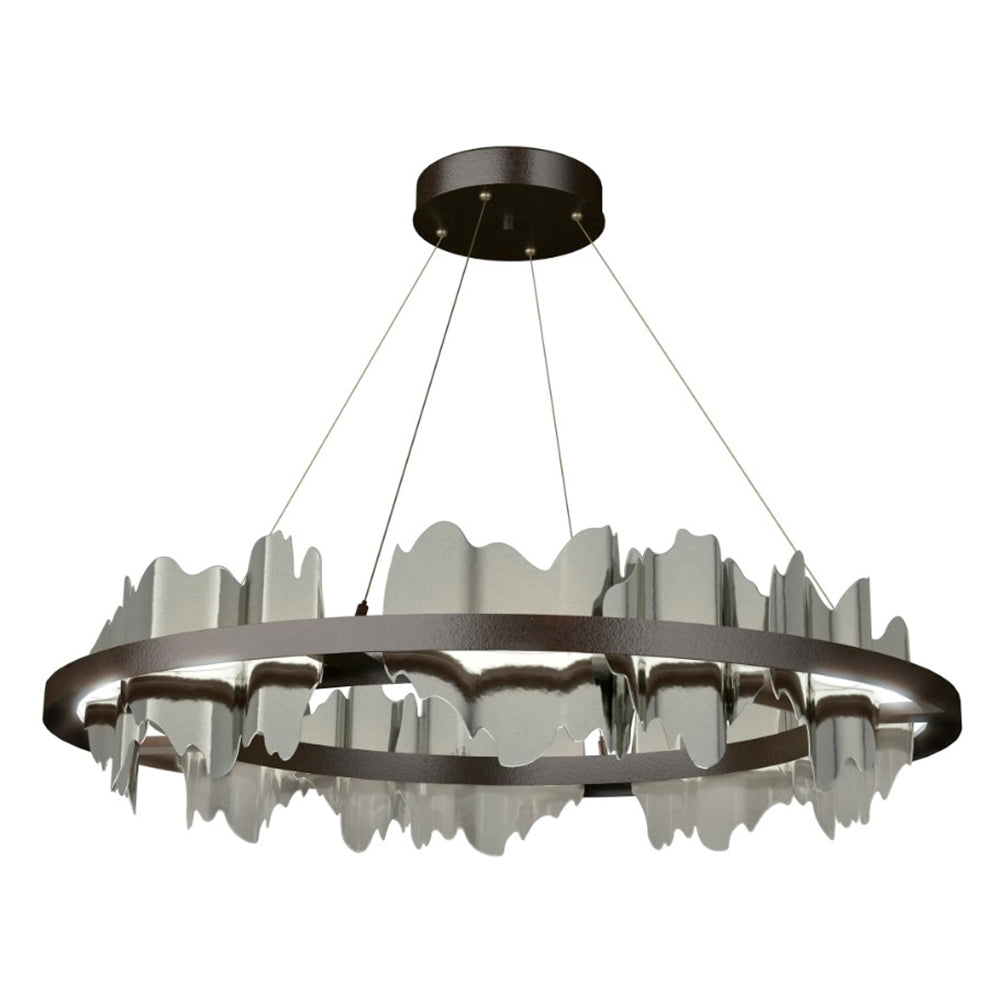 Height adjustable circular LED pendant. Choose a finish for the canopy and fixture frame and an accent for the decorative bent metal plates.