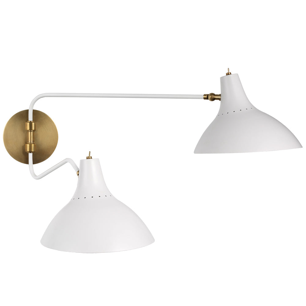 A tribute to the curves and forms of 1950s modernist design, the Charlton Medium Double Wall Light has a swivelling, conical shade and its hinged arm allows the light to be raised, lowered and angled as needed. A striking, contemporary design that has a hint of playfulness, the Charlton is full of personality and adds instant character to any room. Available in three finishes and part of a collection that includes matching floor and table lamps.