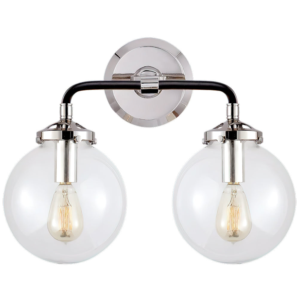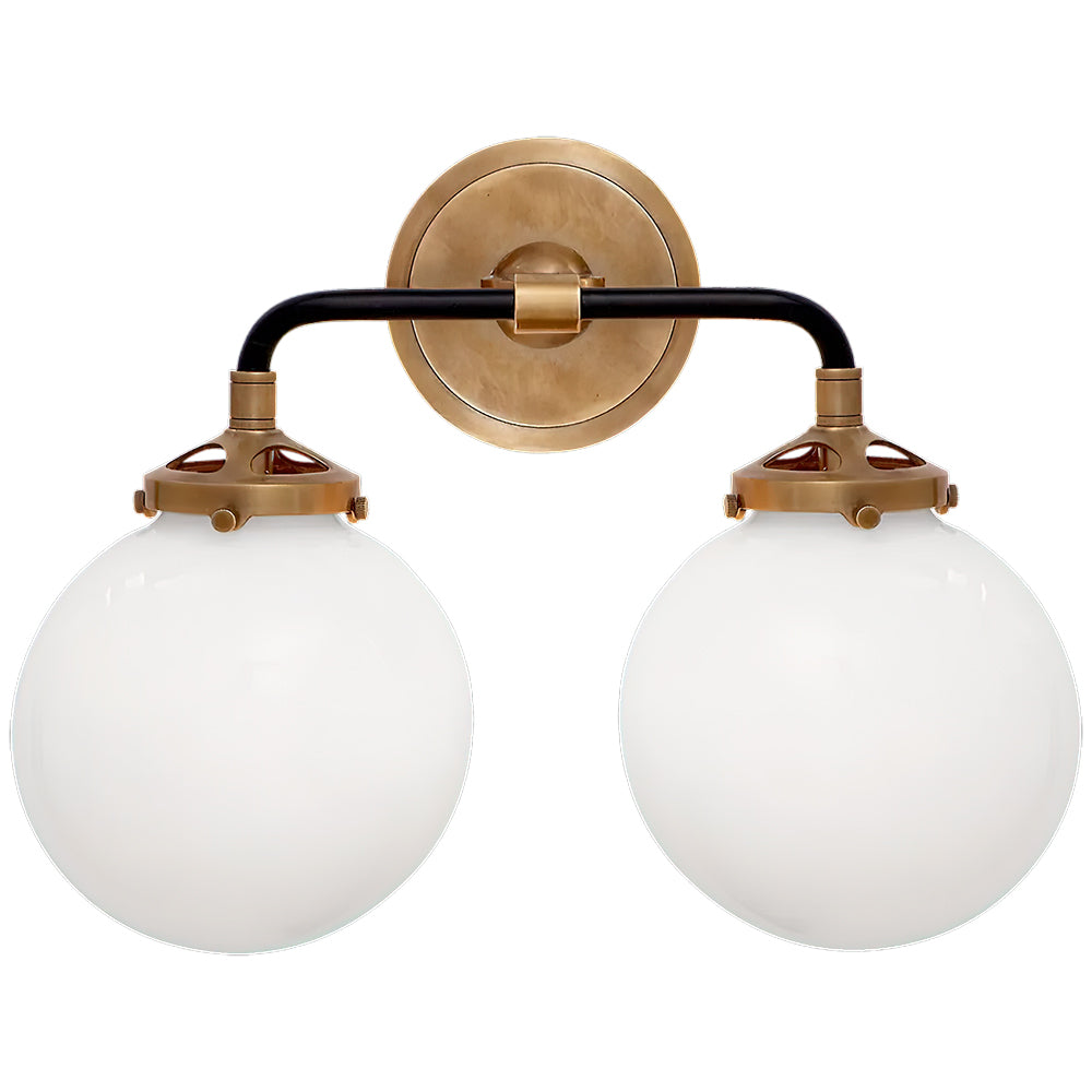 The Bistro Double Light Curved Sconce is in Hand-Rubbed Antique Brass and black with White glass, Polished Nickel and black with Clear glass and Polished Nickel with Clear glass. It has a round backplate. Inspired by light houses and other nautical elements, these lighting fixtures manage to tie into themes that go beyond coastal. The hand-applied finishes may have subtle variation, making each fixture unique.