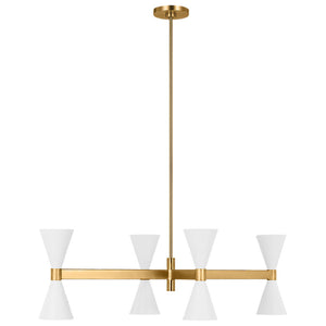 The Aerin Albertine Linear Chandelier for Visual Comfort Studio Collection emits ample light above and below from eight conical lights on a crossed frame. This sophisticated piece provides a strong focal point in a large room and is a versatile style that works in both traditional and contemporary interiors. Ideal for a living room or above a dining table. The Aerin Albertine Linear Chandelier brings a clean geometric look to your interior space. The smooth steel body holds cinched cones and is complemented by glass diffusers, casting warm shadows around your room. This Aerin Albertine Linear Chandelier delivers contemporary style with a vintage-inspired twist. This modern dining room chandelier is made of solid metal with a black or white glass to make the light more concentrated and softer, adding delicate and elegant elements to your house.