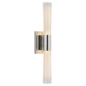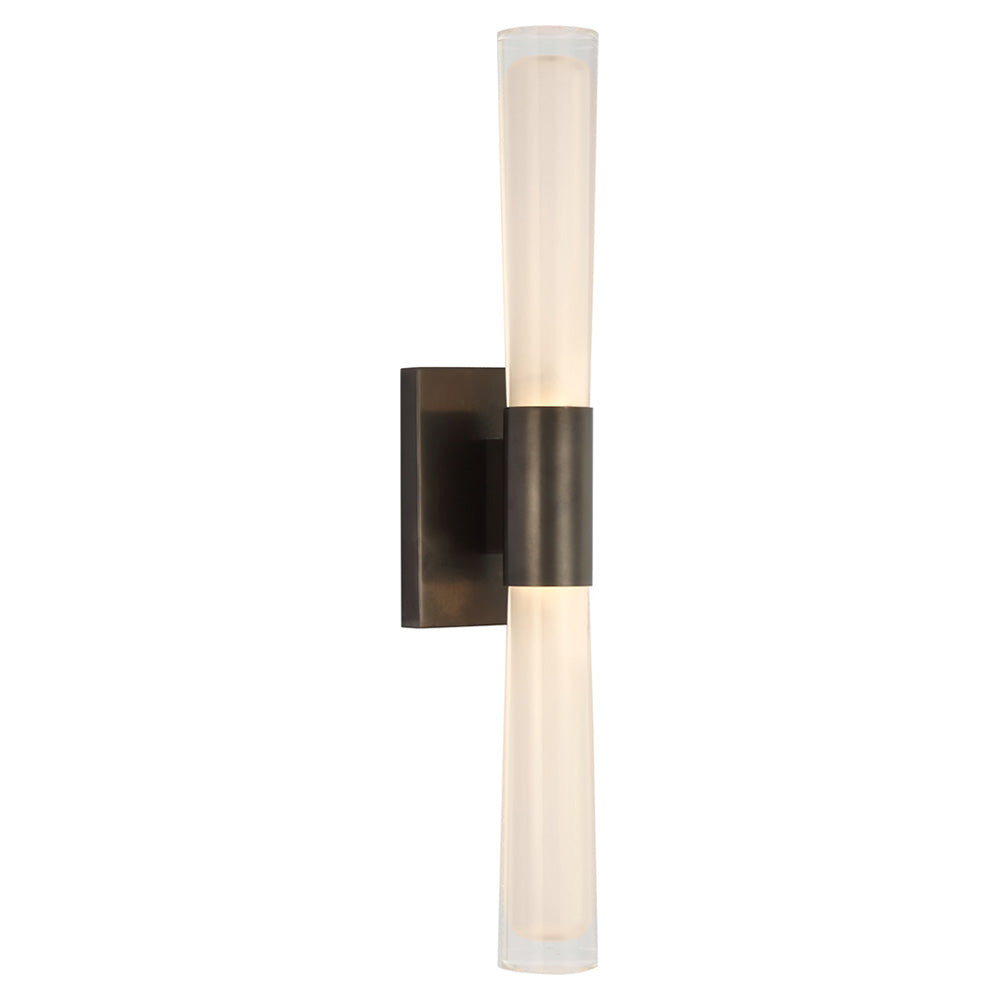 The Brenta sconce is a streamlined approach to mid-century modern style light fixtures. A square wall plate holds this elongated cylindrical glass sconce, which emits a soft light in two directions from an interior double bulb fixture. A stylish yet practical solution for illuminating bathrooms, dressing rooms, and bedrooms, it works particularly well above a mirror, placed horizontally, or situated vertically as a pair on either side.