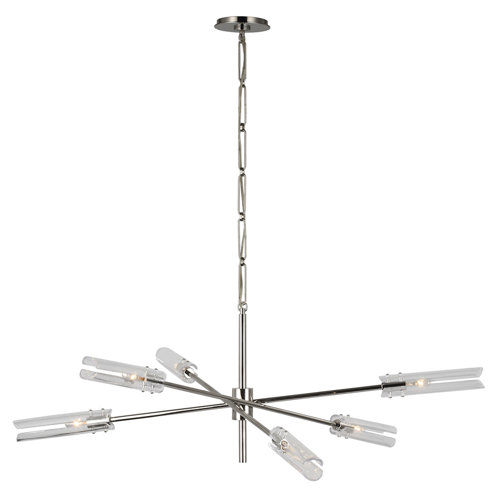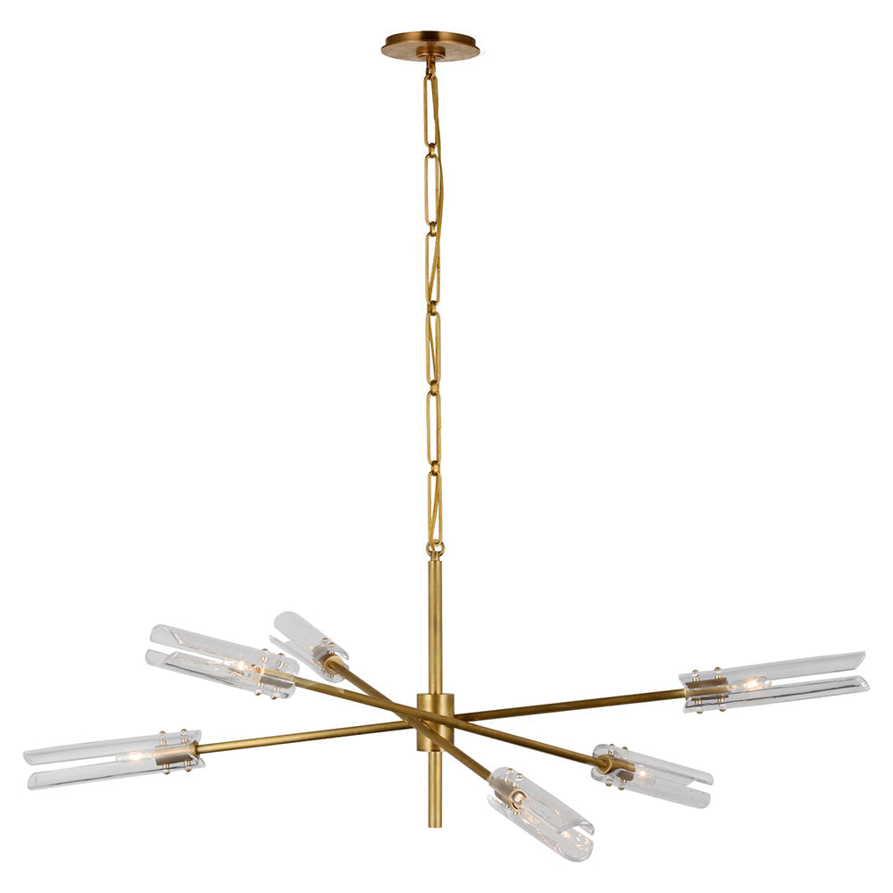 Greet guests with a warm and welcoming glow in the entryway or dress up your dining room for an upcoming dinner party with this eye-catching chandelier.A contemporary interpretation of Mid-Century Modern design, the Casoria XL Radial Chandelier by Aerin provides an elegant focal point.Crafted from eight elongated glass lights on a two-tier linear frame, it has a sculptural quality that adds character to high-ceiling spaces.Casoria XL Radial Chandelier by Aerin comes in two finishes Polished Nickel and Hand-Rubbed Antique Brass.Casoria XL Radial Chandelier by Aerin is perfect light fixture to install in the kitchen, dining room, living room, foyers.