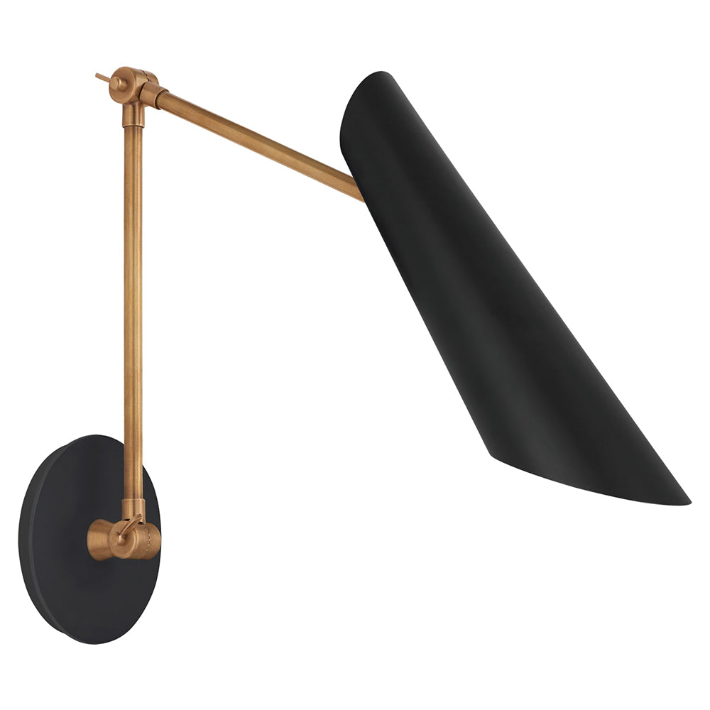 A striking conical sconce that adds Mid-Century Modern character to a room. A movable angled arm allows you to focus light where it is needed most. It is ideal for a study or in a reading nook.