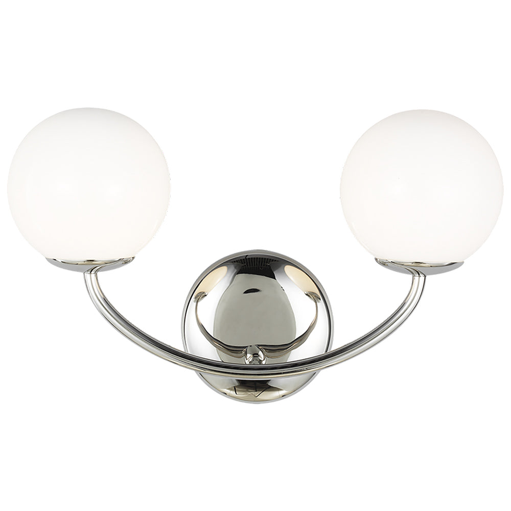 The Aerin collection for Decor House Furniture, expands the Aerin luxury lifestyle brand. This curated collection channels classic midcentury style, with a modern point of view. The collection supports the Aerin philosophy that living beautifully should be effortless. Discover this modern Aerin Galassia Two Light Vanity available in Midnight Black,Polished Nickel and Burnished Brass finishes.The Aerin Galassia Two Light Vanity perfectly balances a glass globe and curving teardrop frame, giving it a contemporary look. The white glass casts a soft, welcoming glow over a space. This piece works particularly well in a hallway. This breathtaking Aerin Galassia Two Light Vanity fixture is a must-have for illuminating any bath and vanity set in urban industrial, rustic, mid-century modern, transitional, traditional, farmhouse, or vintage electric interiors. Make your purchase today to begin your journey to a whole new lighting experience.