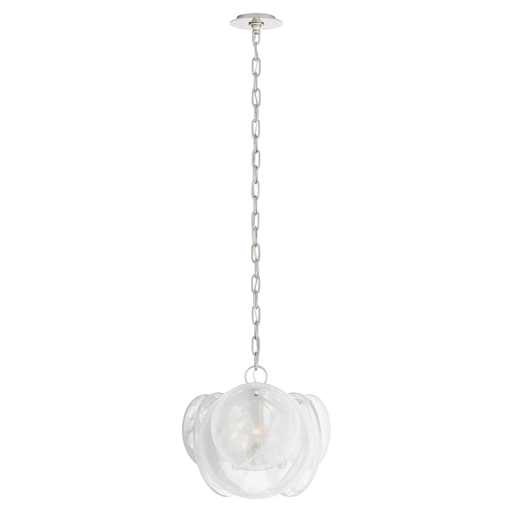 The Loire Petite Chandelier brings a touch of creativity to small, high-ceiling spaces, from bedrooms to staircases. The six-foot long chain holds a frame of white Strie glass plates, which emit a soft, beautiful glow. This artistic piece works well with contemporary décor.