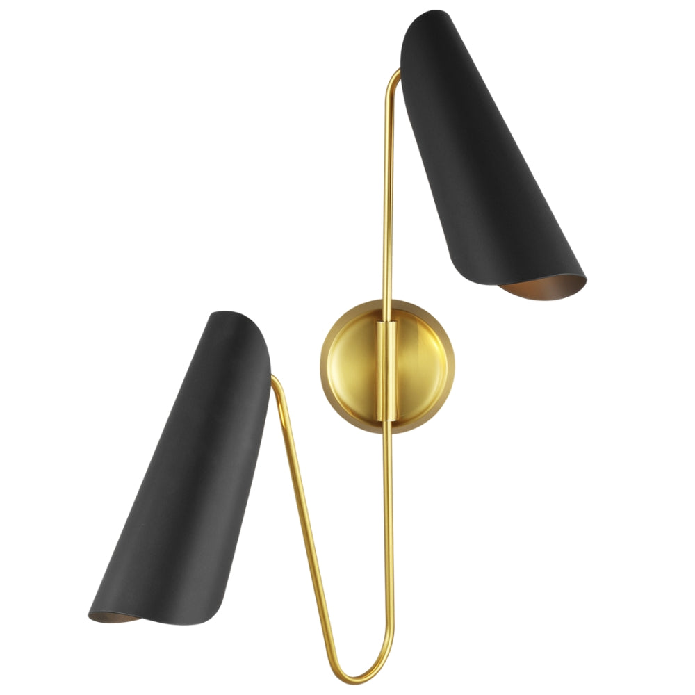 Change your approach to indoor lighting with the new Aerin Tresa Two Light Sconce. Transform any area into a captivating paradise with the stylishly designed Aerin Tresa Two Light Sconce from Visual Comfort & Co. Crafted with two conical shades featuring a classic Mid-Century Modern style and an open edge to allow additional light to pass through, this two-level frame sconce is perfect for creating the ultimate luxurious atmosphere that exudes sophistication and elegance. Discover this modern Aerin Tresa Two Light Sconce in Burnished Brass or Midnight Black at Decor House Furniture. The Aerin Tresa Two Light Sconce is presented in the midcentury modern style and is an unusual combination of smooth and brushed steel elements. Two multi-directional shades with a matte finish evenly illuminate the room. Thin steel rods of the structure connect the shades with a rounded backplate, which is attached to the wall. The soft light of the Sconce directed downwards creates a feeling of comfort and tranquillity in any space.