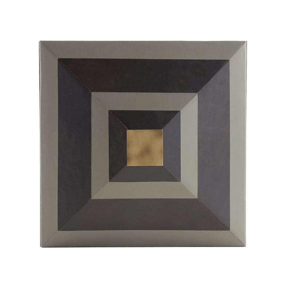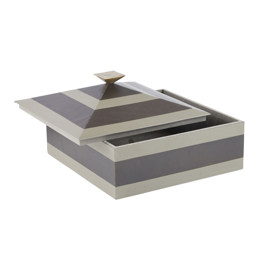Sometimes, the thoughtful little decor pieces are what make a house a home. The perfect way to add depth and texture to your surface space is with this compact and discreet Arteriors Cheshire Box. Tonal stripes add a tailored finish to a two-toned dove and graphite leather box. This pyramid-inspired accessory is topped with a bronze-plated handle that reflects its geometric lines. Lined in soft suede. Finish will vary. A practical yet stylish upgrade that instantly elevates the look of your room. Add a refined accent to your bedroom, bathroom, or living room with this classic Arteriors Cheshire Box. This decorative Arteriors Cheshire Box is ideal for storing jewelry, hair accessories, or even favorite ephemera. It completes the look in any traditional or bohemian setting.