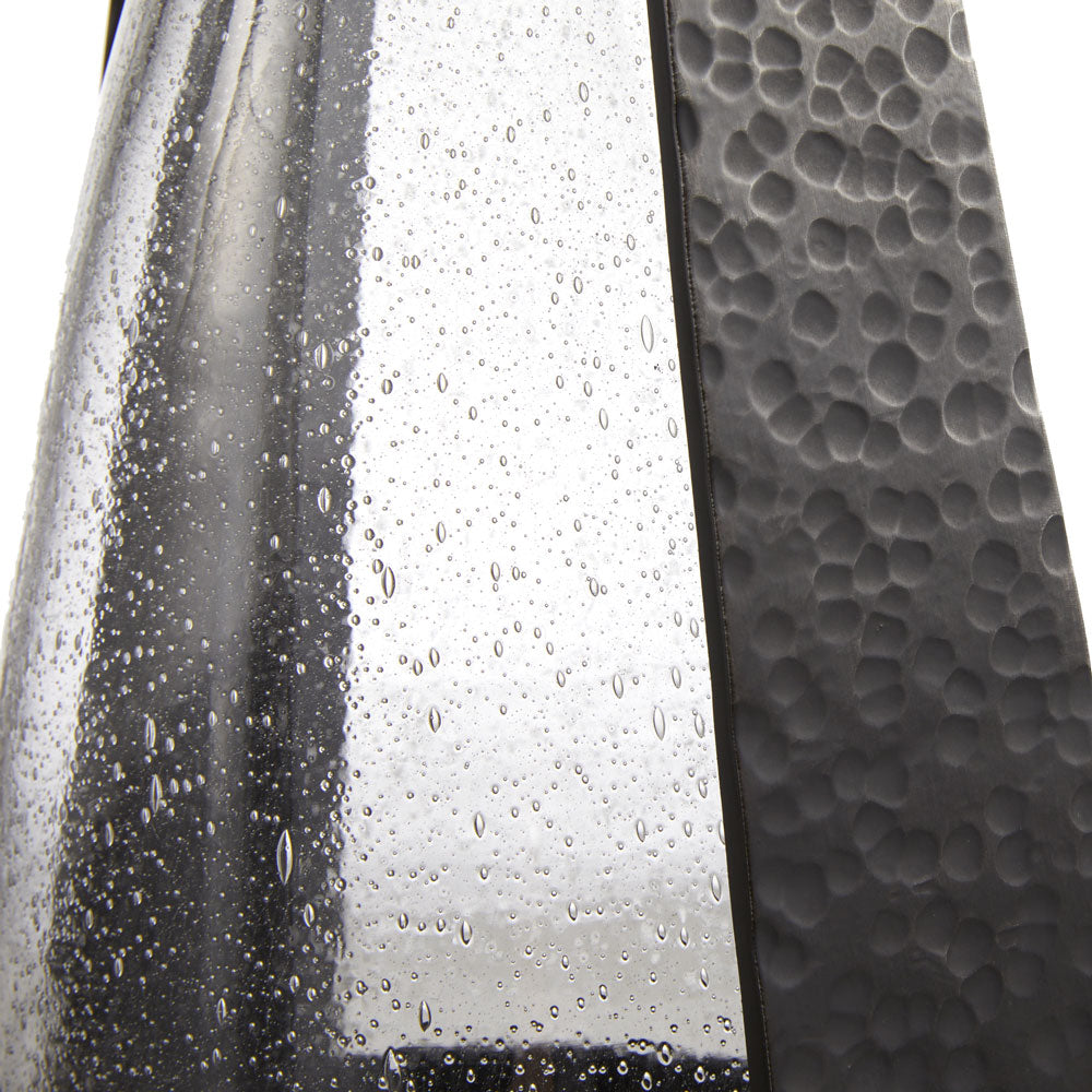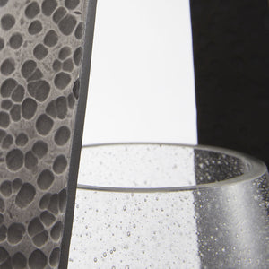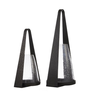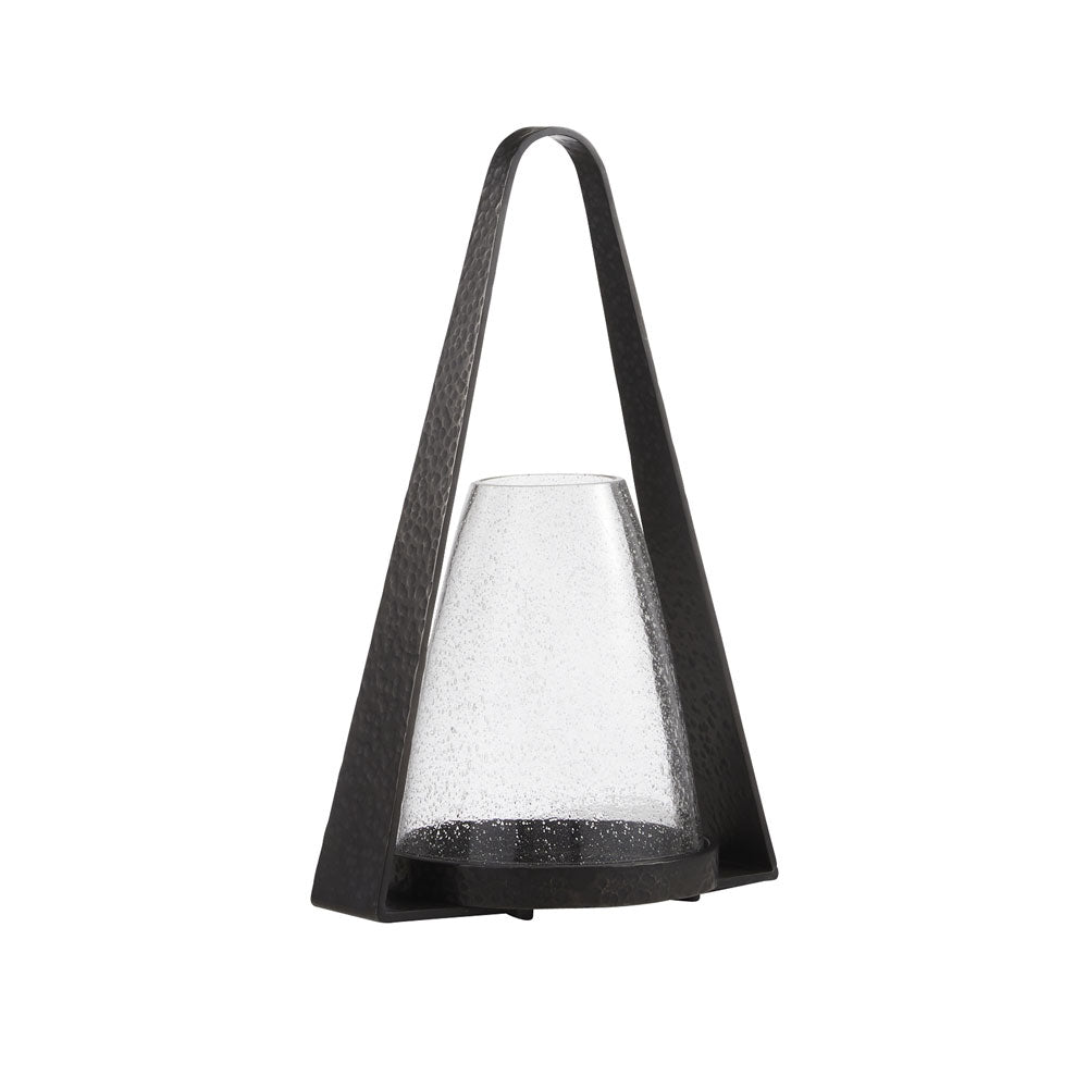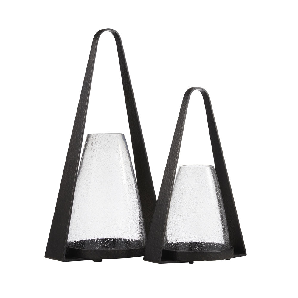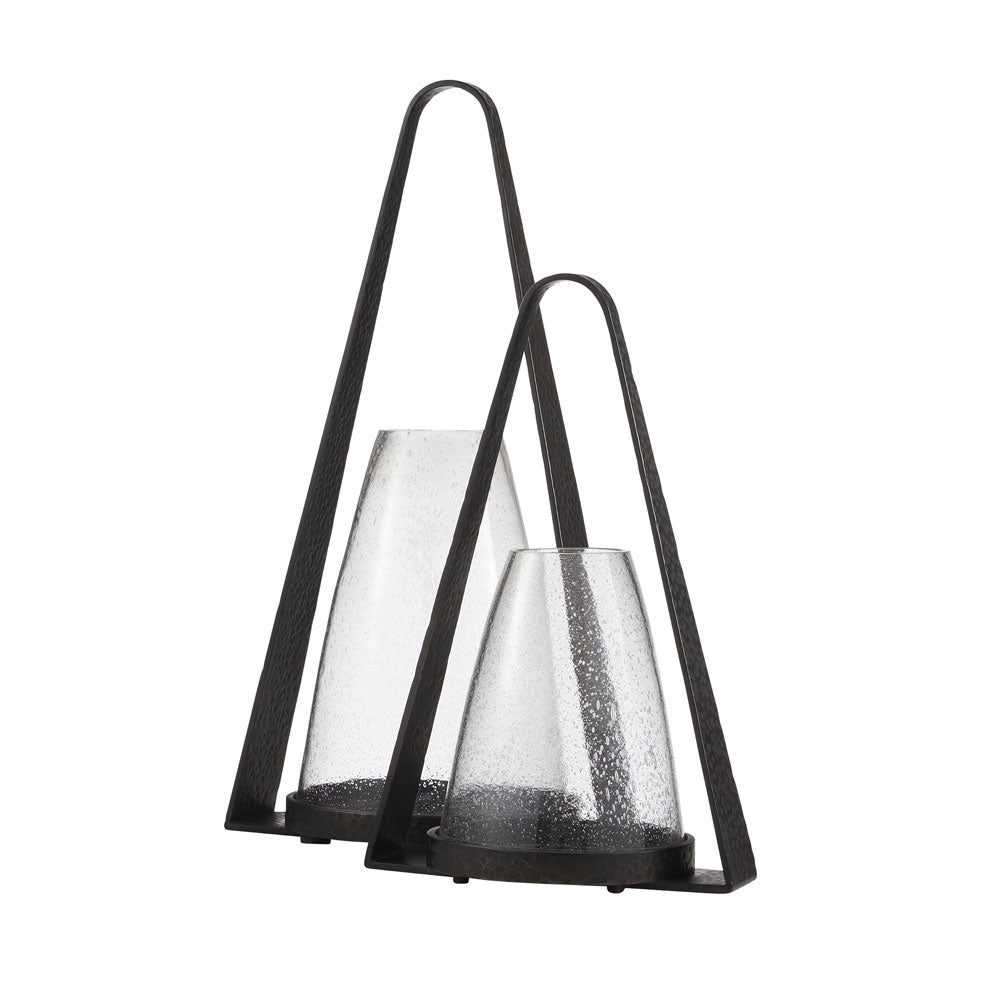 Decorate and illuminate any room in your home with this Arteriors Dayton Hurricanes Set of 2. A pair of elegant hurricanes in clear seedy glass, dayton offers a fresh twist on the traditional floor lantern. With a subtly tapered shape inspired by an equestrian stirrup, the sturdy base and handle of hammered blackened iron feature a top hoop for easy portability. Finish will vary. With a unique design and striking modern details, these elegant Arteriors Dayton Hurricanes Set of 2 add a touch of modern style to your decor. Whether placed in your entryway, living room, or bedroom, these elegant Arteriors Dayton Hurricanes Set of 2 bring a sense of refinement to any space. Gift them to a candle enthusiast or simply treat yourself to a tasteful addition to your home.