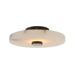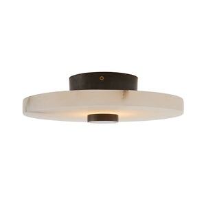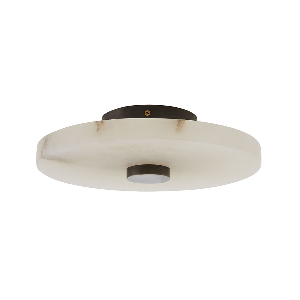 The Moers takes the traditional flush mount design and modernizes it by pairing white alabaster and english bronze iron with an integrated led light. When in use, the illumination highlights delicate details inherent to its natural composition. Finish will vary. Damp-rated, although limited covered outdoor areas may affect finish.
