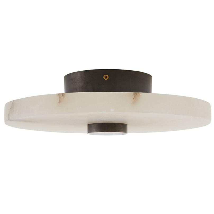 The Moers takes the traditional flush mount design and modernizes it by pairing white alabaster and english bronze iron with an integrated led light. When in use, the illumination highlights delicate details inherent to its natural composition. Finish will vary. Damp-rated, although limited covered outdoor areas may affect finish.