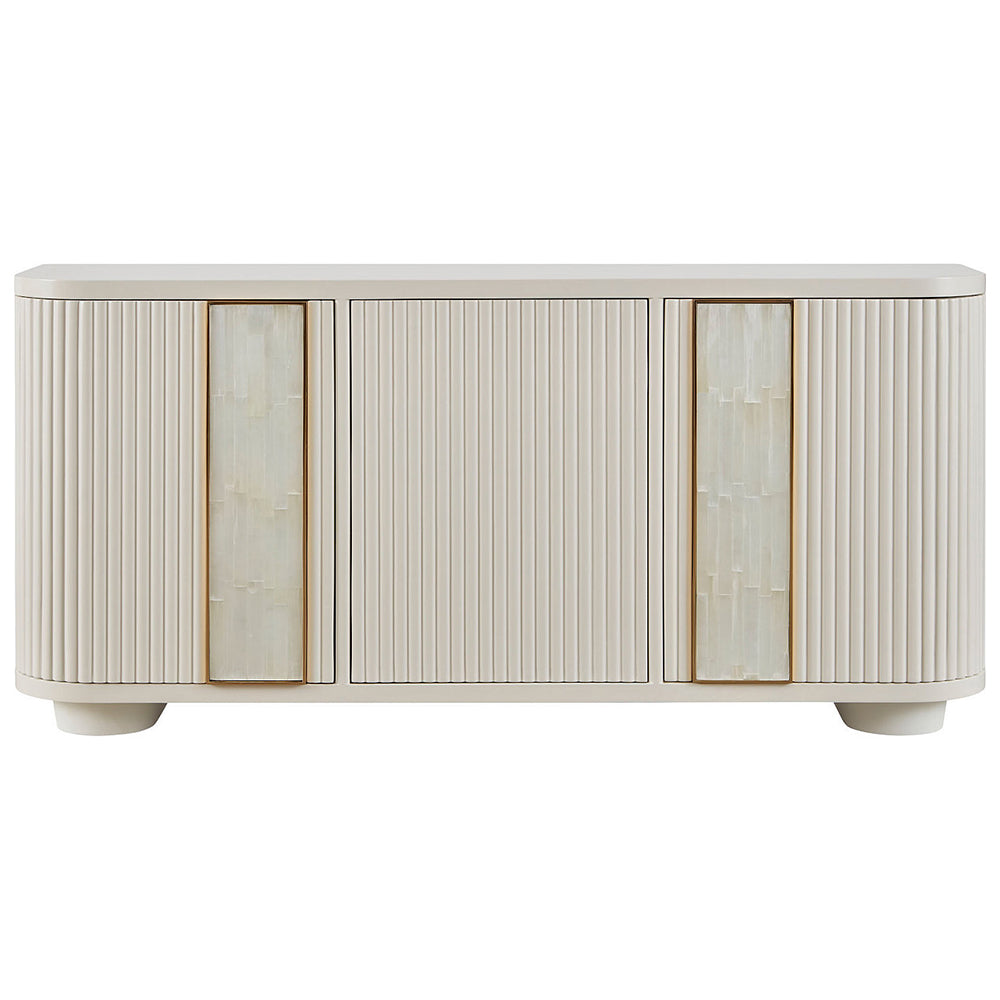 Instantly upgrade your living space with Baker Luxe Harmony Credenza. Luxurious Sideboard should be strong, durable, and visually appealing. It should contribute towards your home’s overall style, fitting in harmoniously while enhancing its beauty. Channel luxury in its simplest form with the Baker Luxe Harmony Credenza. The Baker Luxe Harmony Credenza mirrors the perfect symmetry of the natural world. Its design is accentuated with selenite and encased in brass. The Baker Luxe Harmony Credenza mirrors the perfect symmetry of the natural world. Its design is accentuated with selenite and encased in brass. Crafted using beautiful Selenite inserts on the curved door fronts, this natural material is full of intrigue and texture. The distinctive pattern will become a statement in any home, while also offering elegant storage space for dining or living essentials. These vertical scalloped details wrap themselves around the face and sides of the unit, participating in its indulgent feel. Plain white lacquer is durable and sleek, while brass encasing brings a touch of warmth.