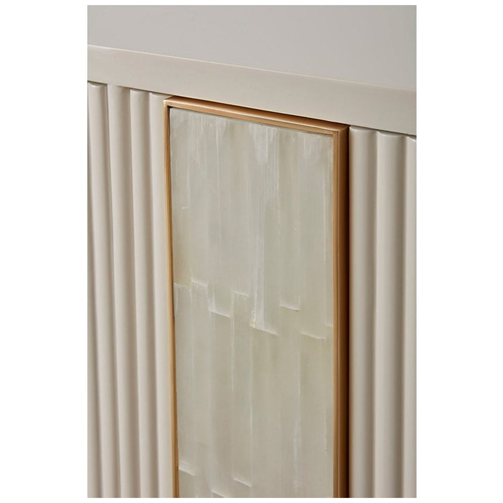 Standard Finish(es): Plain White Lacquer. Selenite inserts on door fronts encased in brass. 1'' vertical scalloping wraps face and sides. Push to open doors. Disclaimer: Selenite is a crystallized gypsum that usually looks silky, pearly and fibrous. It often shows inclusions of other minerals, creating distinctive patterns and reflections. Selenite is a naturally porous material and no two pieces are the same.
