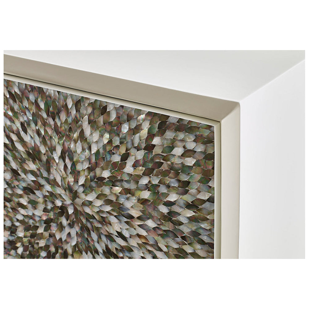 Standard Finish(es): Plain White Lacquer with Mother of Pearl. Mother of Pearl door fronts in radiating petal pattern. Lacquered case with 3 doors. Disclaimer: Produced by mollusks as a shell layer, Mother of Pearl is an iridescent, organic gemstone. It has a resilient, lustrous texture that creates a highly reflective and multicolored look. Due to this gemstone's curved shape and natural origins, each piece displays unique variations.