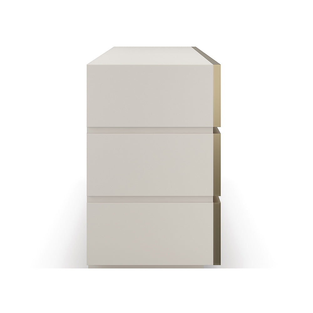 The Caracole Bedrock dresser is crafted to be a timeless piece of furniture for any bedroom. Its Almond Milk case and plinth base exude elegance, while the six drawer fronts in gray sandstone with metal trim in Champagne Gold add a unique, yet subtle touch of sophistication. Undermount guides make it a highly functional statement of luxury.