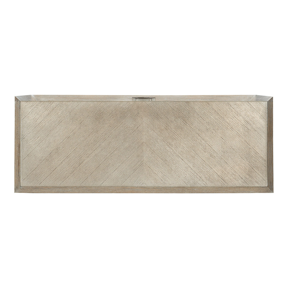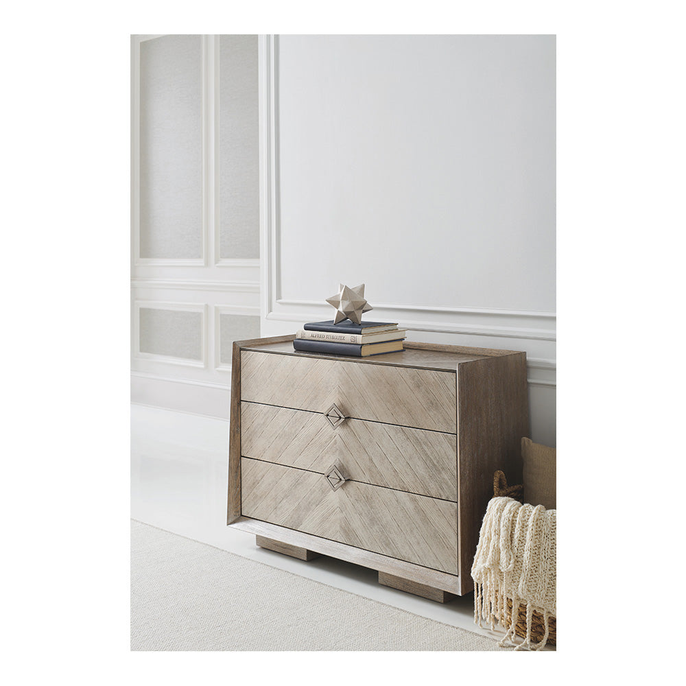 Product Description: Reflecting the modern organic beauty found only in nature, this remarkable chest lends authentic character to a space. Its simple silhouette is accentuated by perfectly matched directional wood grain veneers that create a one-of-a-kind chevron pattern. An easygoing shade of Ash Driftwood highlights the stunning wood grains featured along its exterior while a Silver Driftwood finish brings out the beauty of the woodgrain pattern on top. A metal bead in Sundance Gold outlines the top and adds another touch of reflectivity while geometric drawer pulls and block feet give it substantial presence.