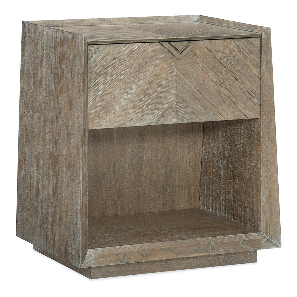 Say ''goodnight'' in style with this beautiful nightstand. It boasts a simple, slightly tapered silhouette brought to life with exquisitely matched directional woodgrain veneers in a one-of-a-kind chevron pattern. A casual yet elegant finish of Ash Driftwood highlights the beauty of its stunning veneers and a bead of Sundance Gold gives the top edge a touch of luxe. This nightstand's one drawer is fully finished in an elegant shade of Putty while an open lower shelf is perfect for keeping a few of your favorite things close at hand.