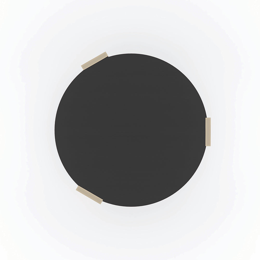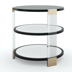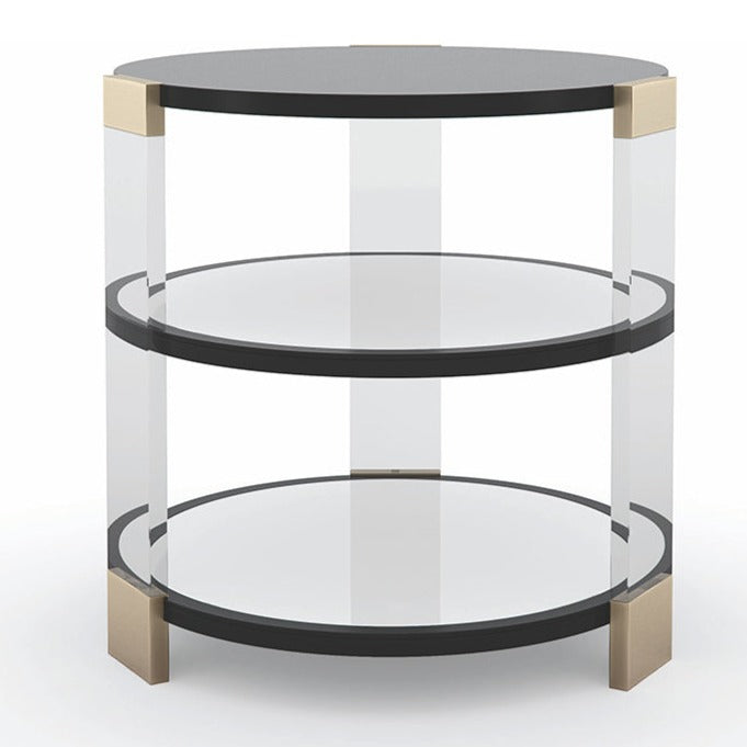 Artful and alluring, this round side table creates unexpected moments of color, pattern, and reflection. A tabletop and two shelves in Tuxedo Black appear to float within clear acrylic posts for a look that stirs interest, without imposing. Adding to its allure, the center and bottom shelves are mirrored to give a glimpse of Silk Road, original artwork by Iris Feng, digitally rendered and hand-applied beneath the shelf above. Metal trim in Whisper of Gold lends a shimmering accent.