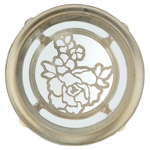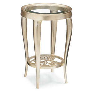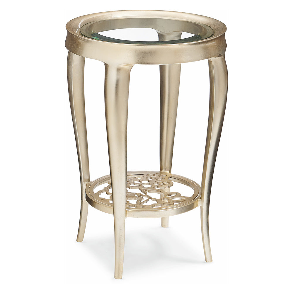 Cut metal grilles come to life in this end table that easily blends with other designs. This small table is luminous with its beveled glass top surrounded by a wide concave metal apron and graceful cabriole legs, bathed in Oracle silver leaf finish. This petite piece's updated style exhibits a metal stretcher of cutout flowers arranged in a geometric pattern. This bouquet is Just For You.