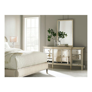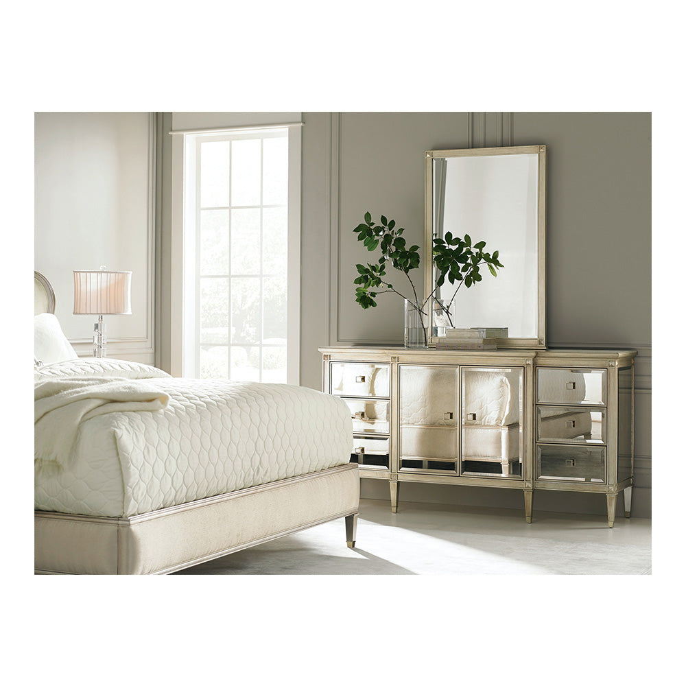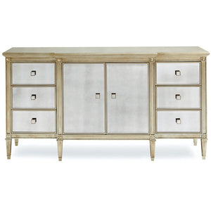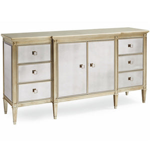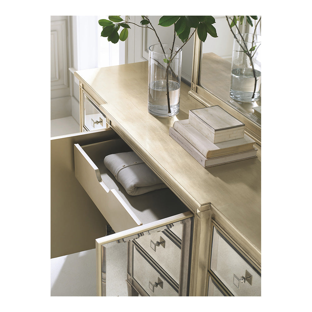 Product Description: Linear Italian styling has been given a modern twist with the addition of a lustrous Auric silver leaf finish and beautiful beveled antique mirror facades. This carved dresser features six soft-close side drawers with custom-designed square metal/mirrored pulls. Two center doors open to reveal a tray drawer and one shelf for generous storage. The entire interior is finished in sparking Gold Bullion Paint. Beautifully carved square tapered feet with metal ferrules lift this piece off the ground in style.