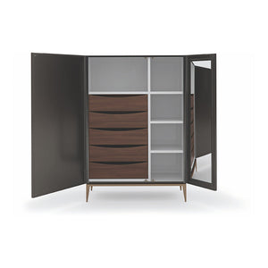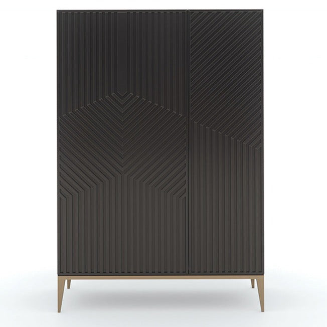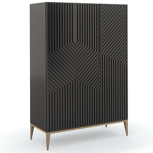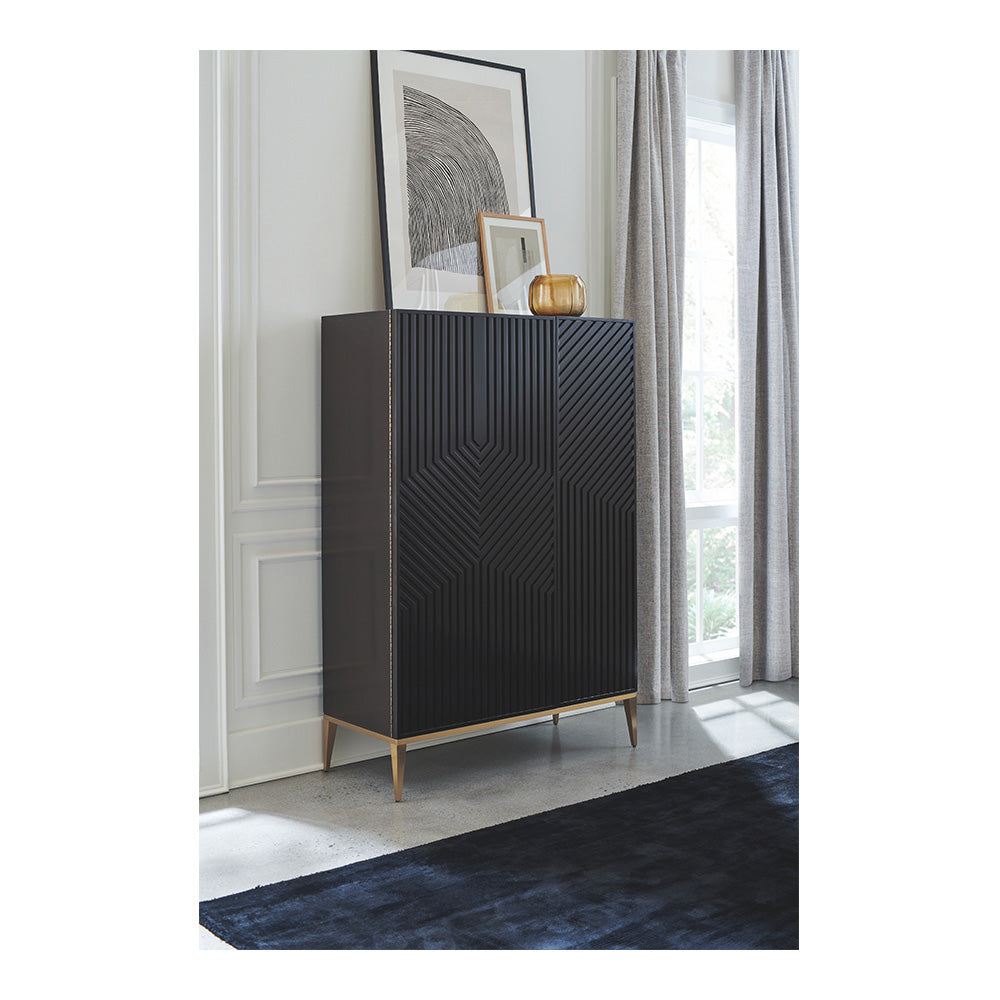 Drawing the eye with its distinctive design, this tall chest introduces a bold, modern graphic to any interior. Thin wood strips applied to the door panels create texture and a linear labyrinth for added dimension. Generous storage on the left offers five drawers with side guides and open storage on top, complemented by three adjustable shelves on the right and a full-length mirror on the back of the door for dressing. Tapered legs in Champagne Gold lend a brilliant accent and warm metallic.