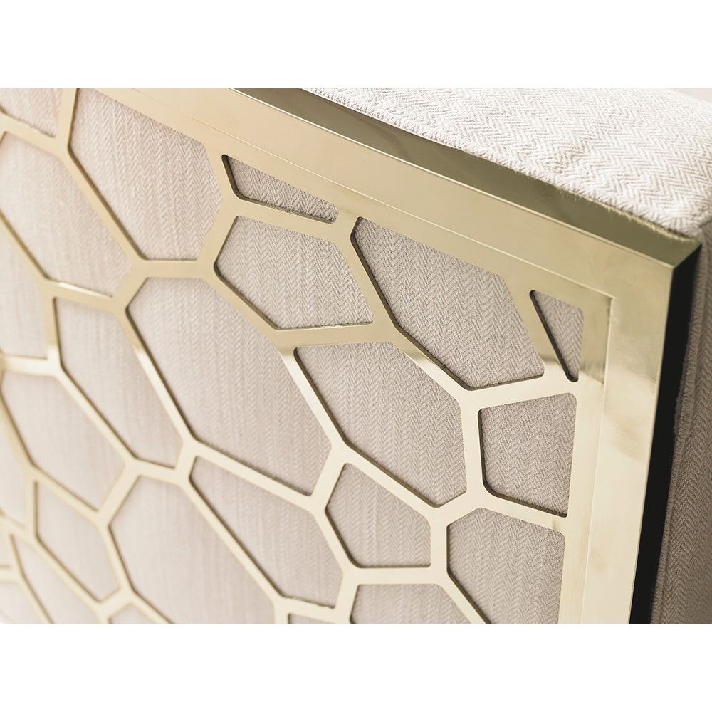 Get the party started with a chair they’ll be talking about long after they leave. We design our product with our clients’ satisfaction in mind. Custom engineered frame wrapped in a Gold Bullion metal tone. A micro-herringbone pattern in off-white linen-blend fabric offers simplistic beauty.