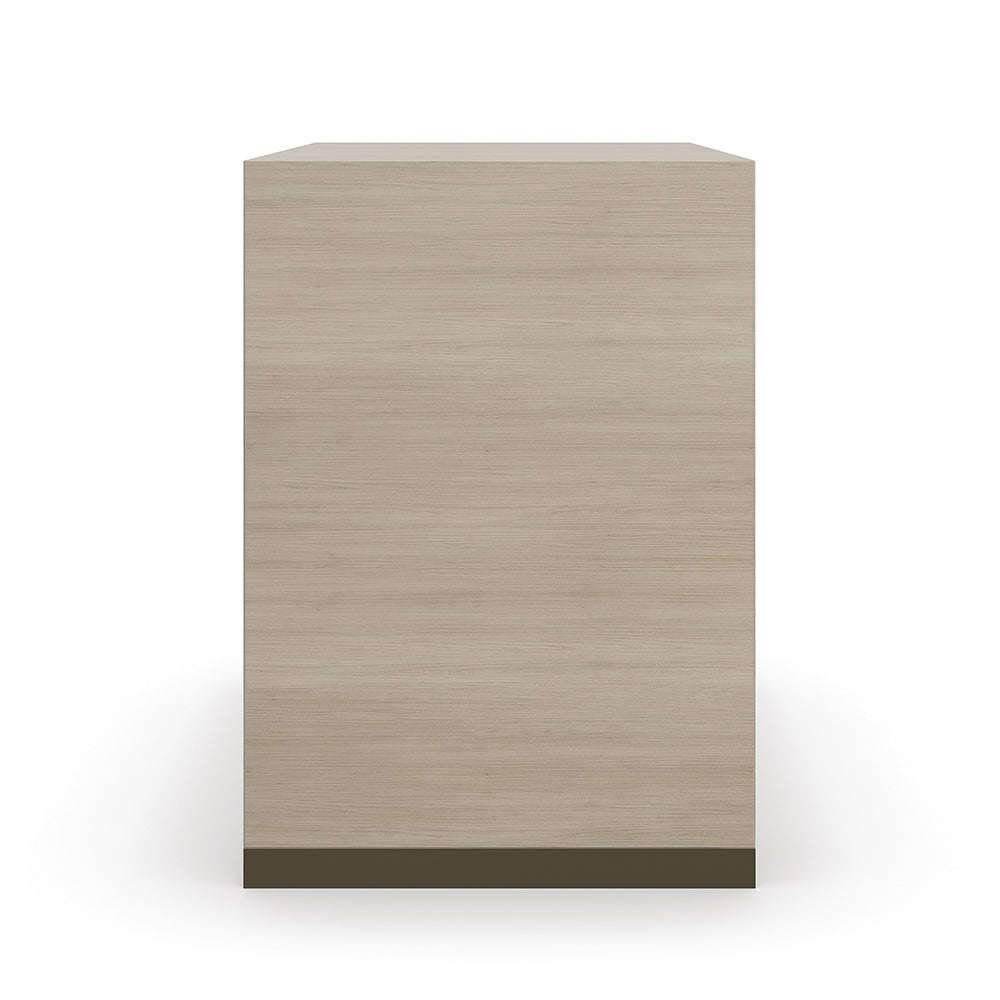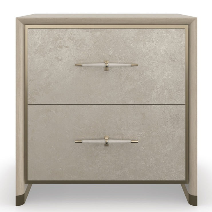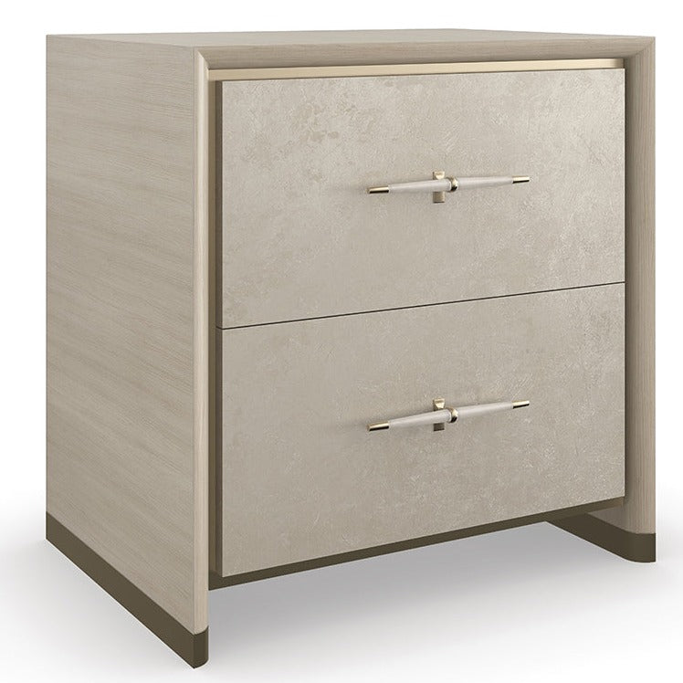 Complete your bedroom with the sophisticated elegance of the Hang Up Small Nightstand. Crafted with a Dry Martini case frame, two Winter Frost drawers with soft-close undermount guides, and a uniquely metal-capped bottom of end panels in Brushed Gold, while the interior is lined in luxurious Linen. With hand-stitched vinyl-wrapped hardware and wire management access, this nightstand is the perfect blend of refined luxury and modern practicality.