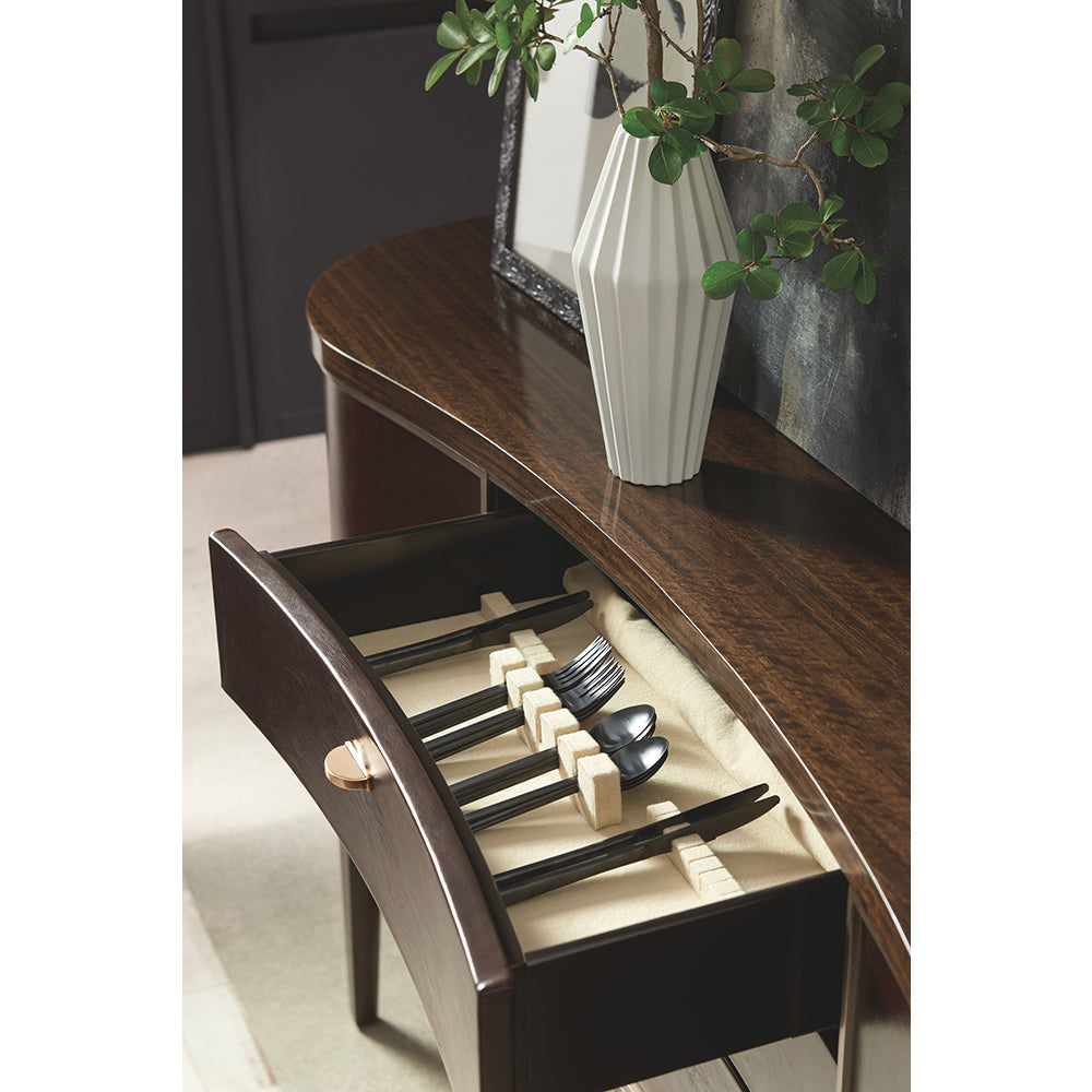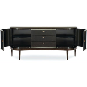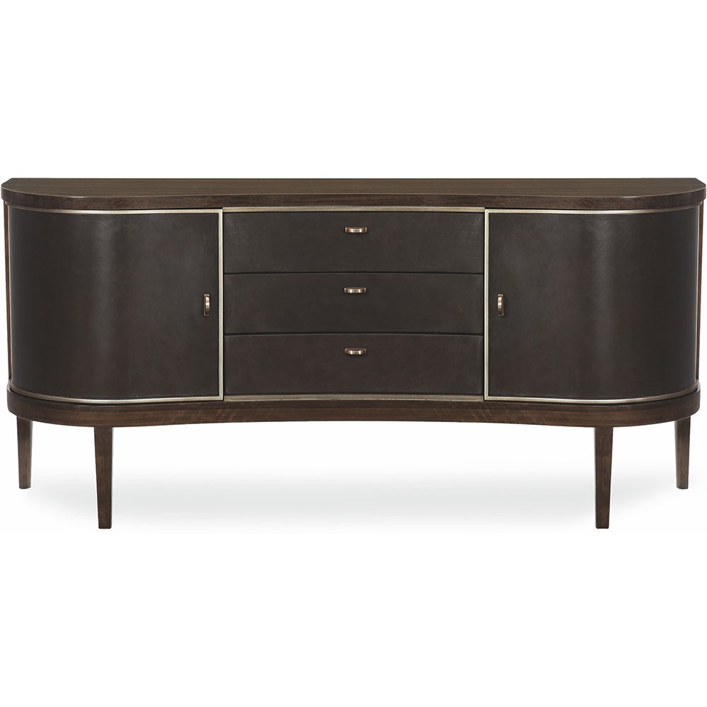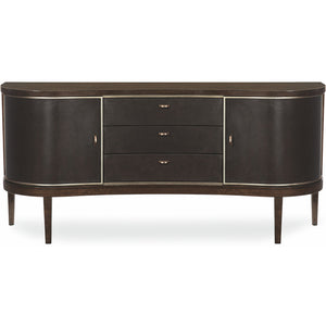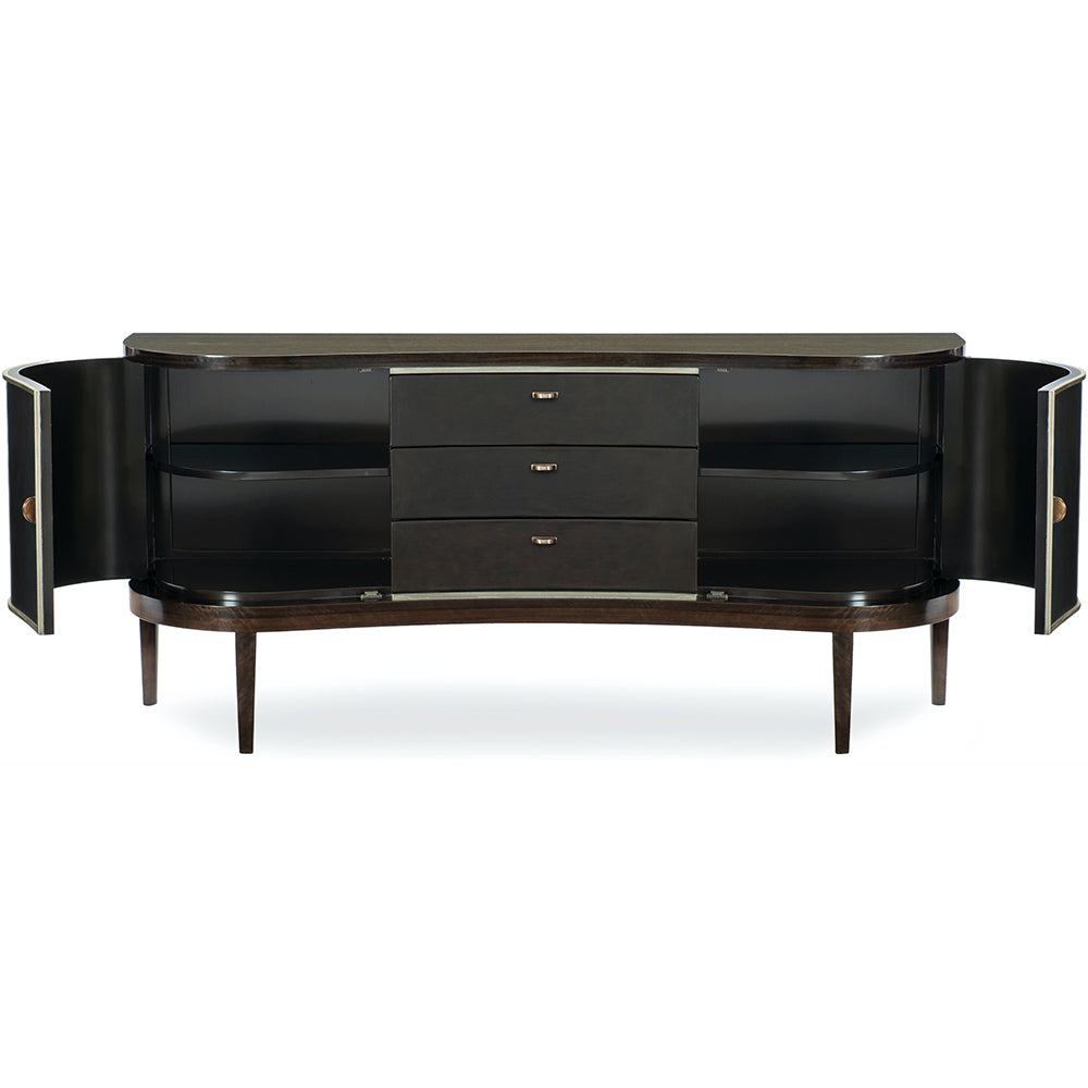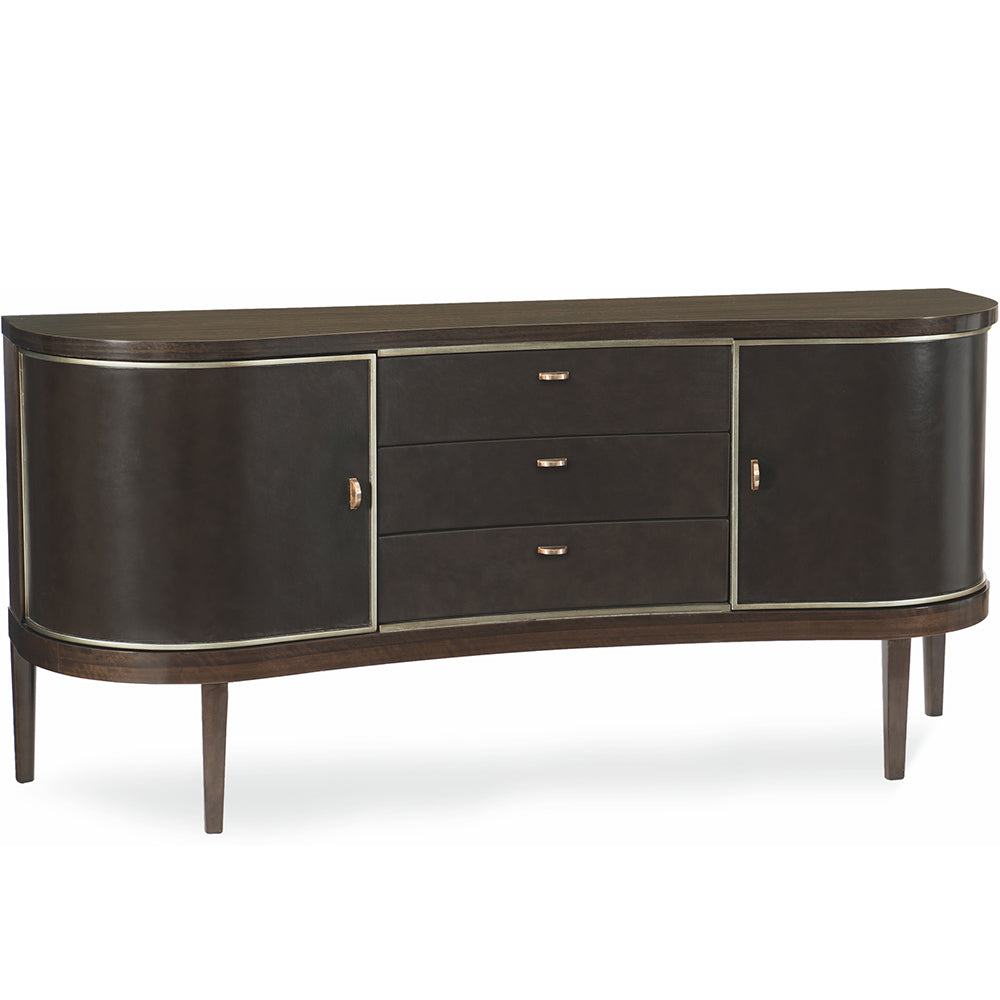 The Curving forms and long horizontal lines of the Streamlined Moderne movement have been updated in this low sideboard that is the perfect height for dining room service. Its high-style appeal comes from the fumed figured eucalyptus wood that has been finished to a high sheen in sultry Aged Bourbon and swept into two dramatic convex curves on each end of the piece. Three concave center drawers complete the graceful flow of this sideboard. They are wrapped in dark leather, trimmed in Smoked Bronze, painted on the inside in Dark Chocolate, and finished with elongated custom metal hardware. Behind the curvaceous exterior doors, find two cabinets painted in Dark Chocolate, each with one adjustable shelf. The sideboard rests off the ground on slender tapered legs.