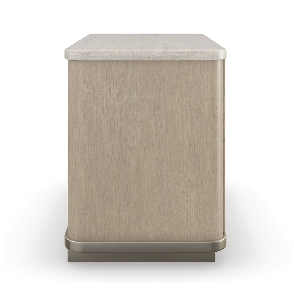 The Rhythm Nightstand by Caracole offers stylish, luxurious refinement to any bedroom. Crafted with a tasteful combination of cream travertine stone and sun-drenched oak, its graceful lines and exquisite detailing blend comfort and elegance. The two drawers featuring soft-close undermount guides ensure smooth, effortless operation, while the neutral metallic frame and UV linen interiors make for a beautiful, practical storage solution. Finer details such as wire management access complete the look, creating a piece that will last for years to come.
