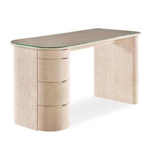 Brighten up your day, and your workspace, with the clean, contemporary look of this office Century Furniture Micco Desk with Glass Top. The Century Furniture Micco Desk with Glass Top is full of movement as there is not a straight edge on any side. Wrapped completely in raffia and painted in an off white finish the desk features four drawers with nickel finished hardware for storage and a glass top for writing. The ample surface area gives you room to use your computer, do your paperwork, and display family photos.The beautiful detailing and smart design give you a compact workstation that will fit in small areas like living rooms, bedrooms, and temporary home offices. Sturdiness and durability are essential elements of any piece of furniture and this Century Furniture Micco Desk with Glass Top is more than just a pretty face.
