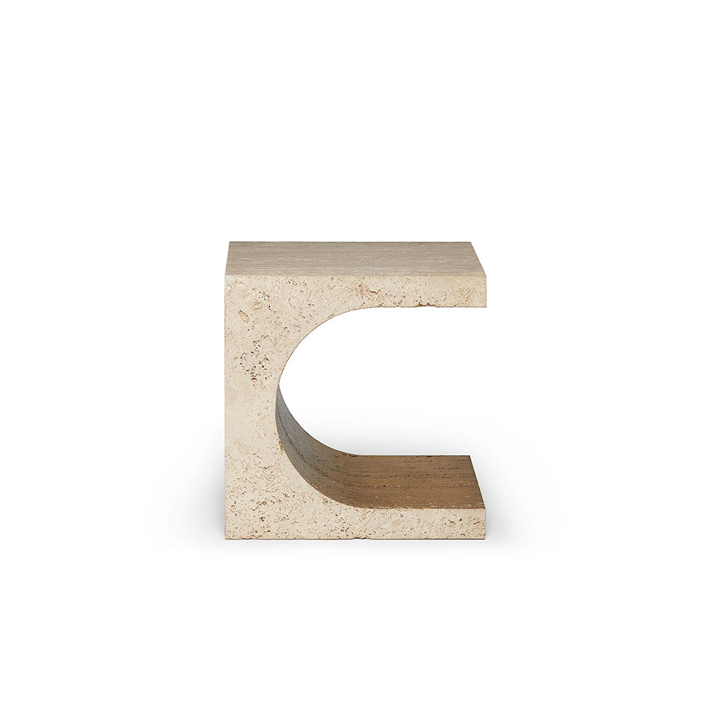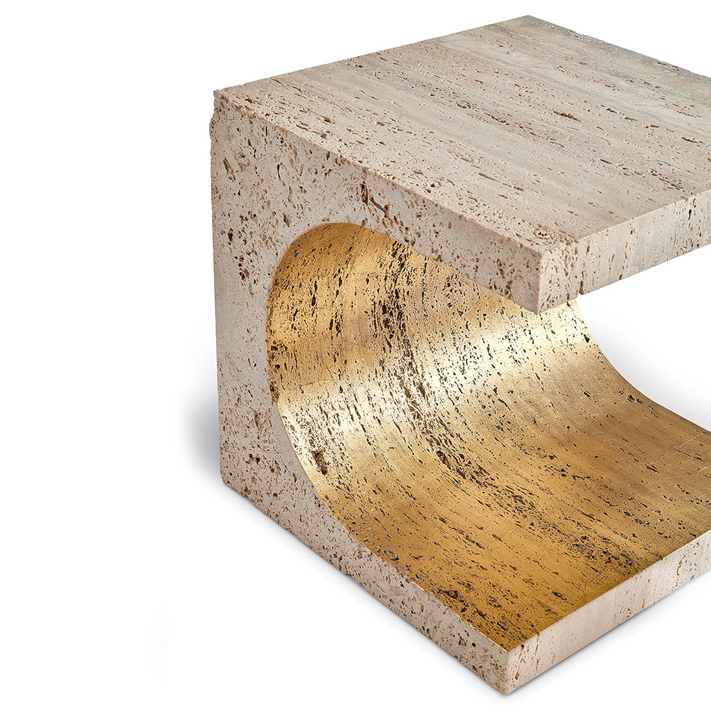 The Canyon Side Table is a keepsake of the enigmatic forces of Nature. Canyons are formed either by the movement of water or wind, or by the stillness of weathering. This side table is carved from a stone block, and the boundaries are either angular or curved. The porous texture of the Travertine breathes on the surface of the top and sides. And in its core, the gold leaf is hand gilded in the stone. The Canyon encloses a purposeful materiality of nature’s wonders.