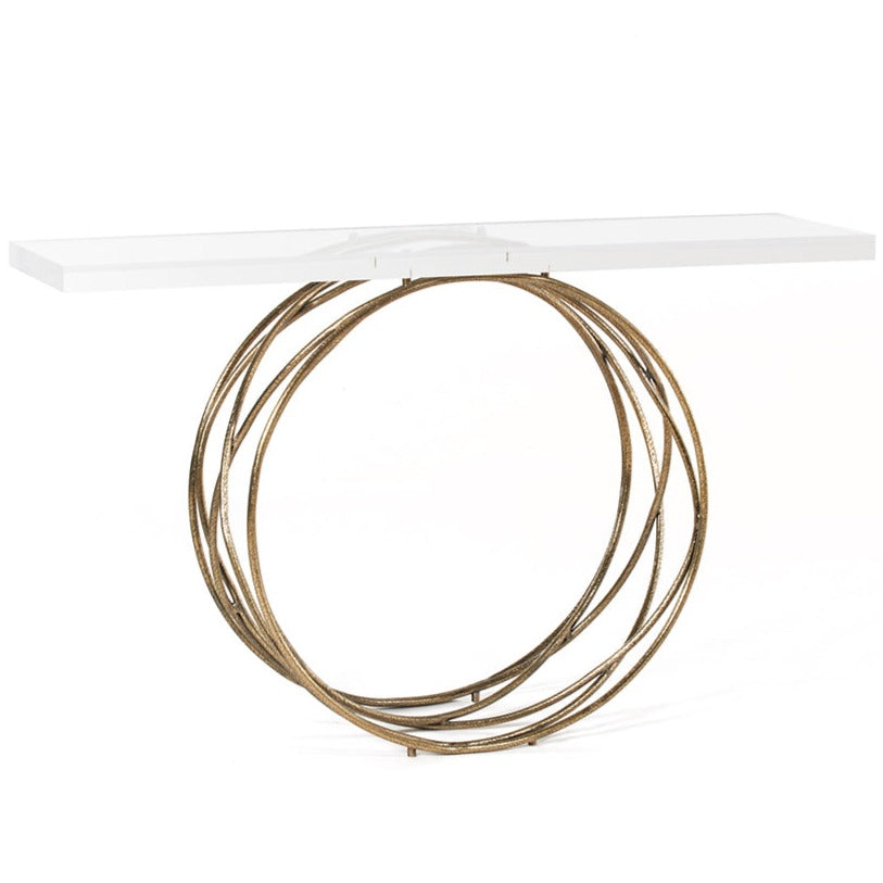 The Halo Console is inspired by the perpetual force of the ocean. Its hand hammered brass structure encapsulates the movement of waves, while the clear acrylic top symbolizes the purity of water.