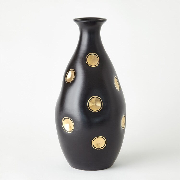 Indulge in pure luxury with the Global Views Dimples Vase – Black Bulbous. The Global Views Dimples Vase is crafted from exquisite Italian ceramic and adorned with 14k gold accents, this watertight vase is perfect for displaying your most prized floral arrangements. The Global Views Dimples Vase is elegant, sophisticated, and effortlessly chic. This vase is a must-have for any artful home. Dust with a dry cloth to maintain its pristine appearance.