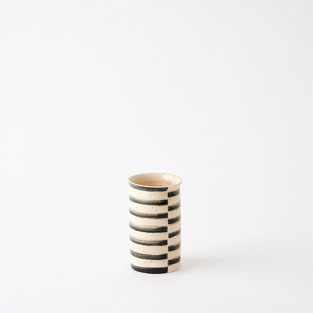 Introducing the Jail Break Cylindrical Vase, a stunning piece handcrafted from ivory Portuguese ceramic. Its striking black stripes represent confidence and uniqueness, making it a standout in any space. Add a touch of boldness and individuality to your decor with this luxurious vase.
