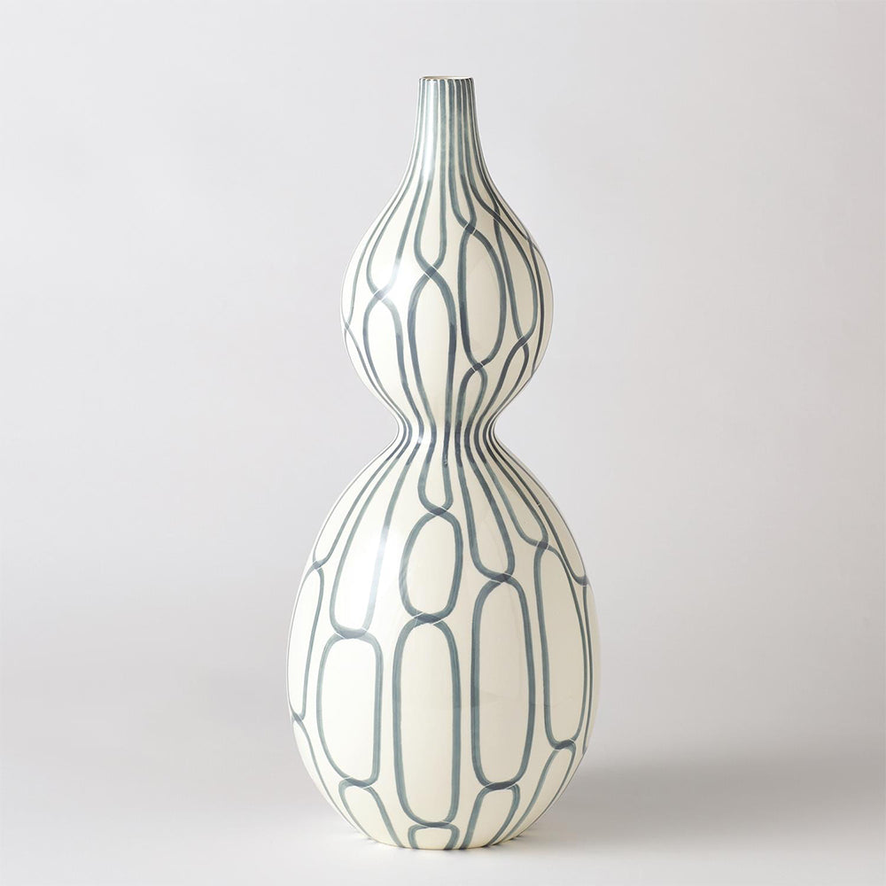 Blue ceramic. Double bulb shape with linking trellis pattern.